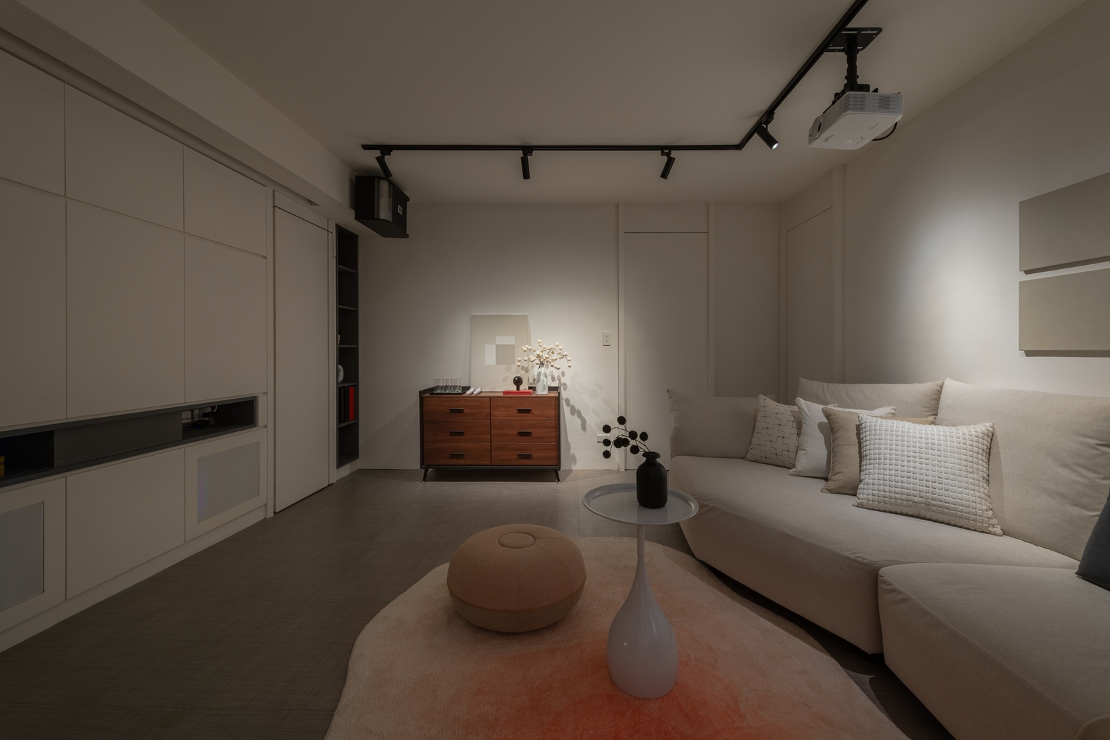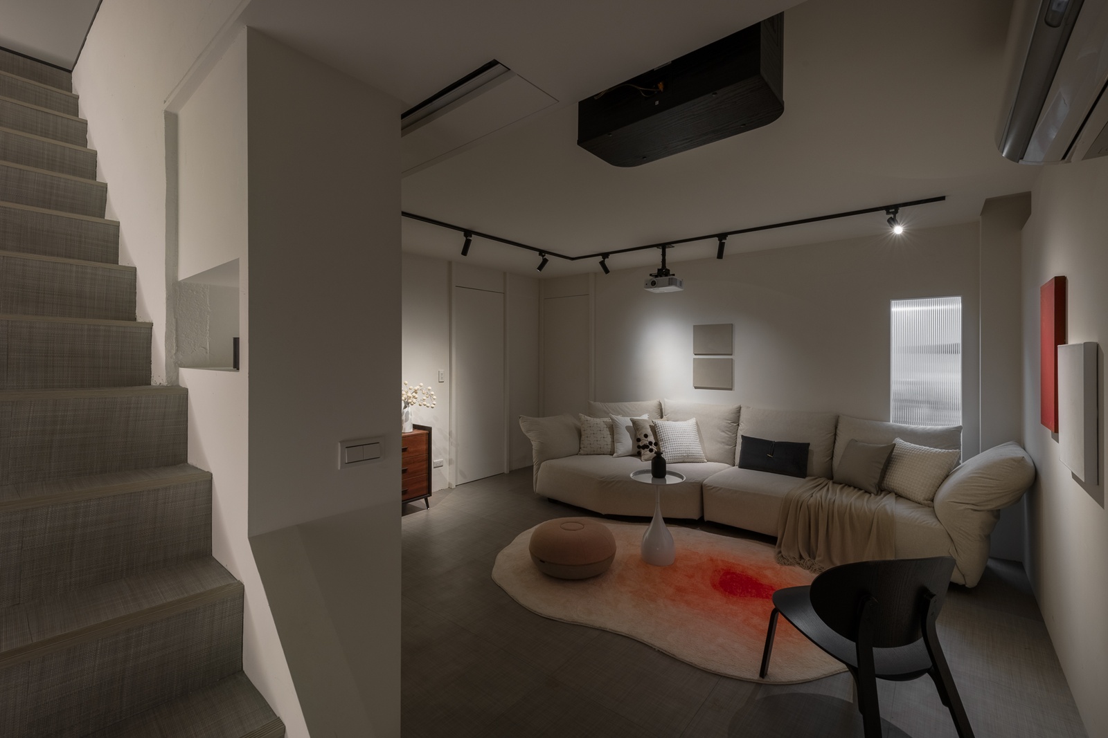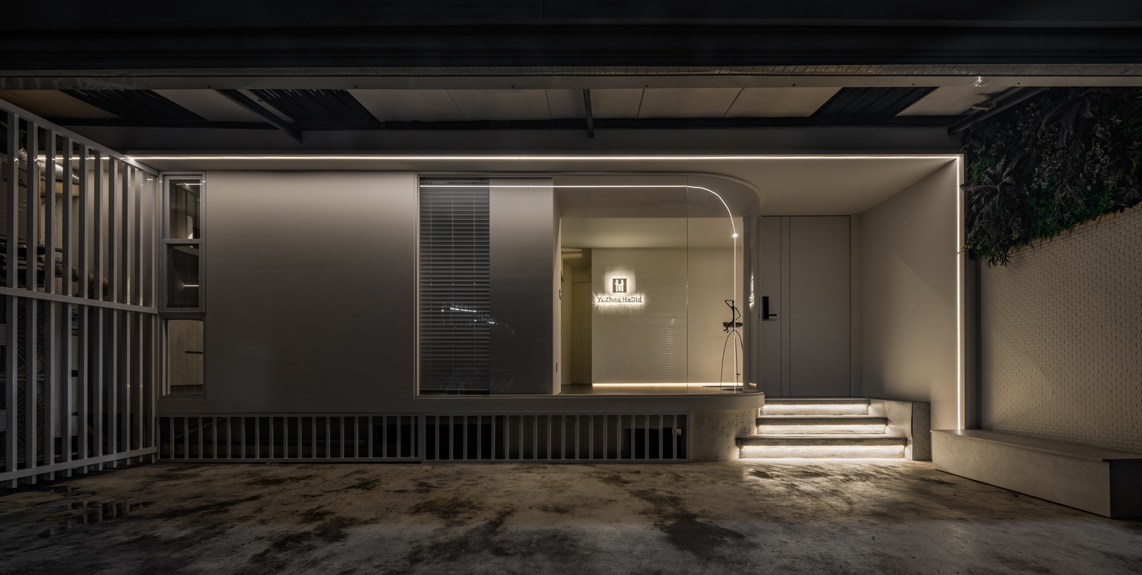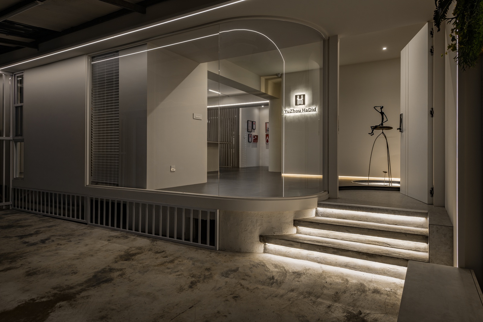 外觀以弧形玻璃立面綻放,輕盈而透明;白色線性格柵則如律動的節拍,將城市的紛擾柔化。室內延續弧形語彙,線性燈光如流動的筆觸,消弭了硬朗感。色彩以淺灰、米白為基調,交織木質紋理,透過不同材質的拼接與對比,營造豐富層次。空間因此不僅是形式,更是一種「氛圍的呼吸」。