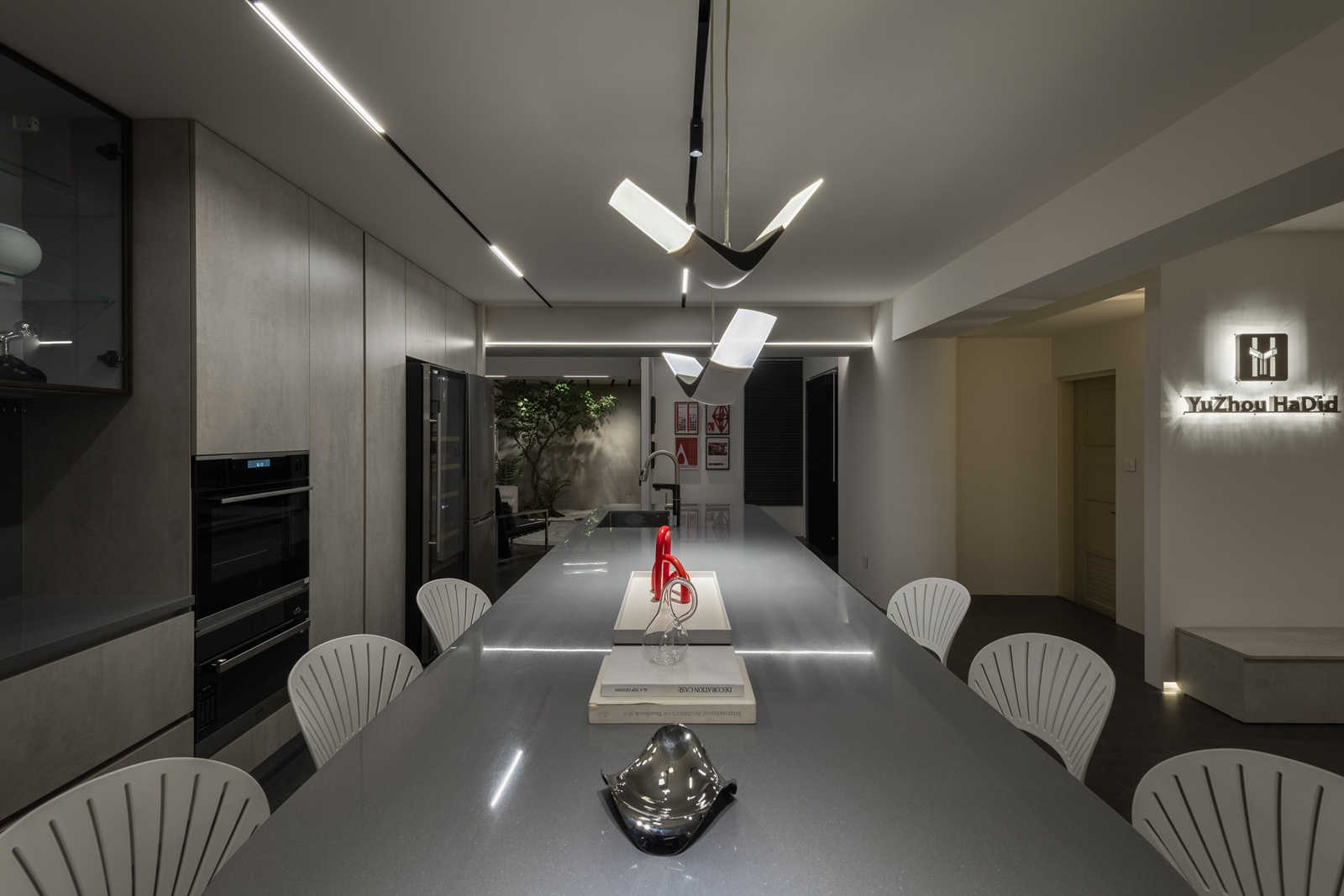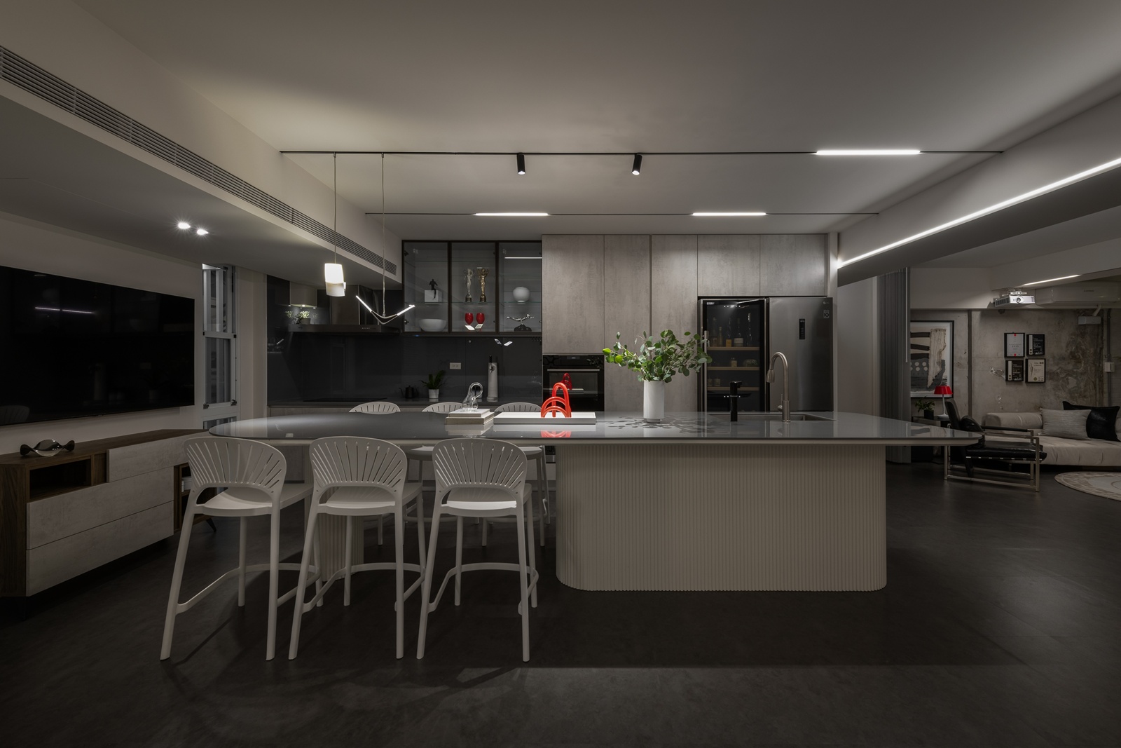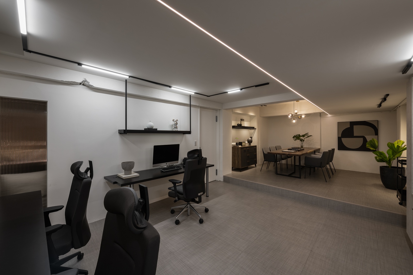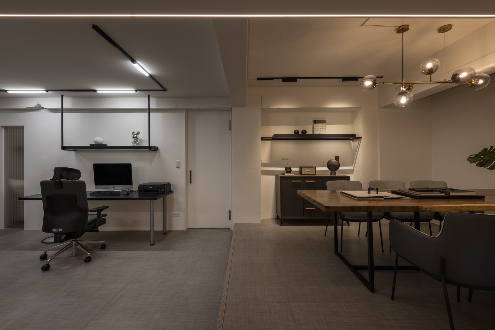 以「無牆」的姿態,打造最自由的秩序。弧形線條、大面積玻璃與通透格局,讓視線與動線皆無礙,各功能區彼此借景,體現了「彈性共生」的深度詮釋。燈光不只是照明,更是情緒的詩句:線性、軌道與吊燈交織,為每個場域定義專屬的氛圍。這裡不僅是辦公場所,而是人與人共生的舞台。