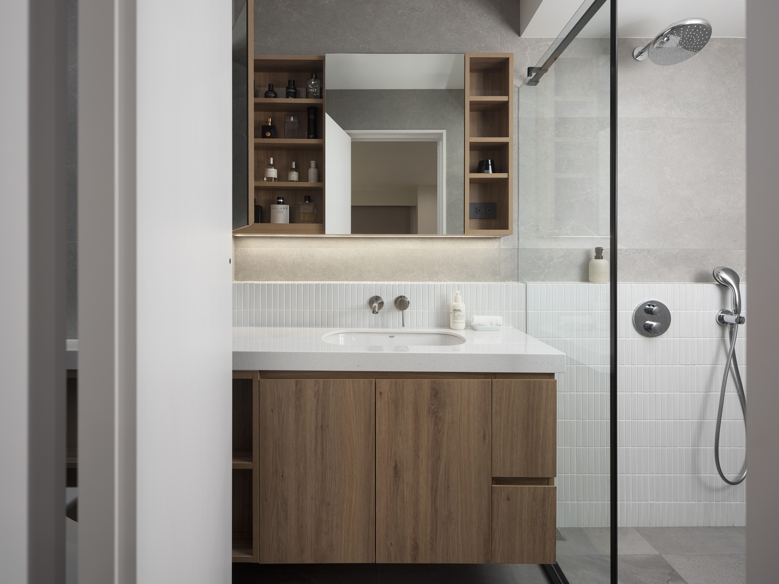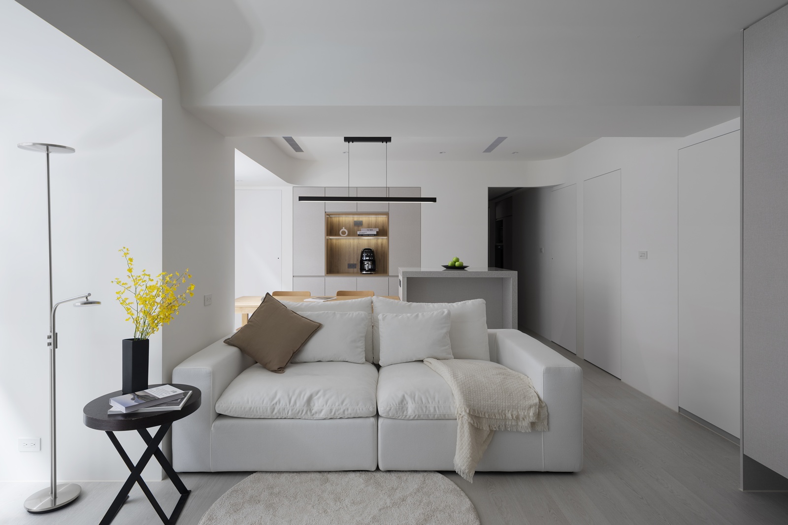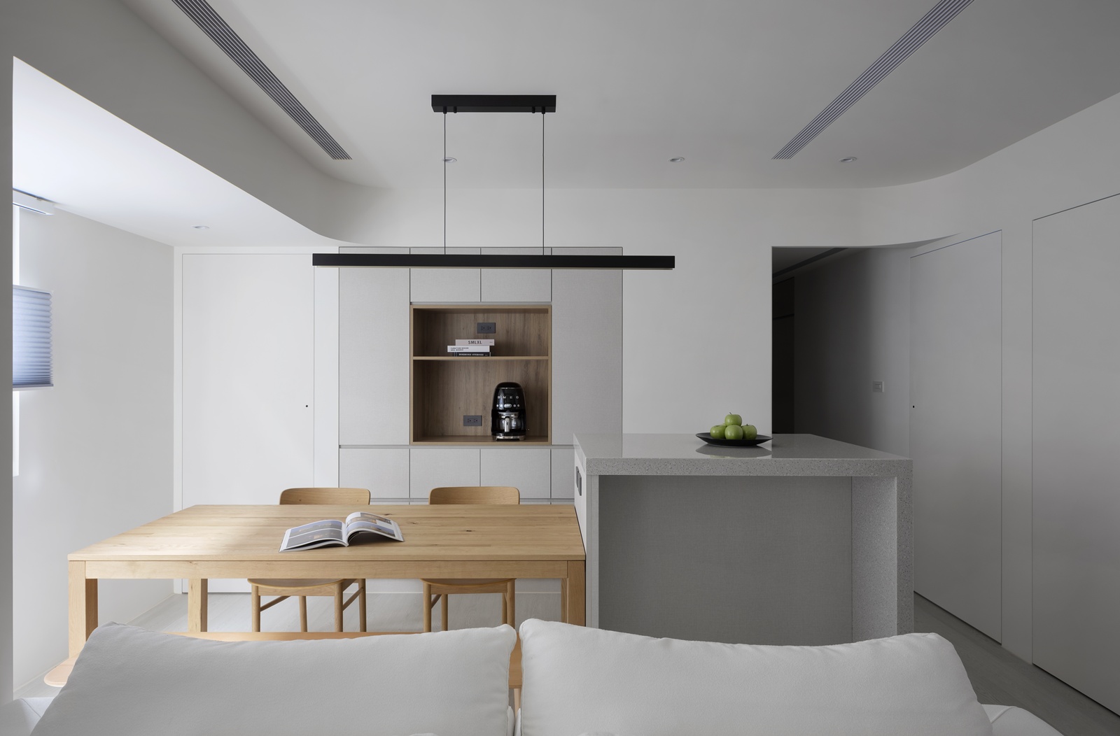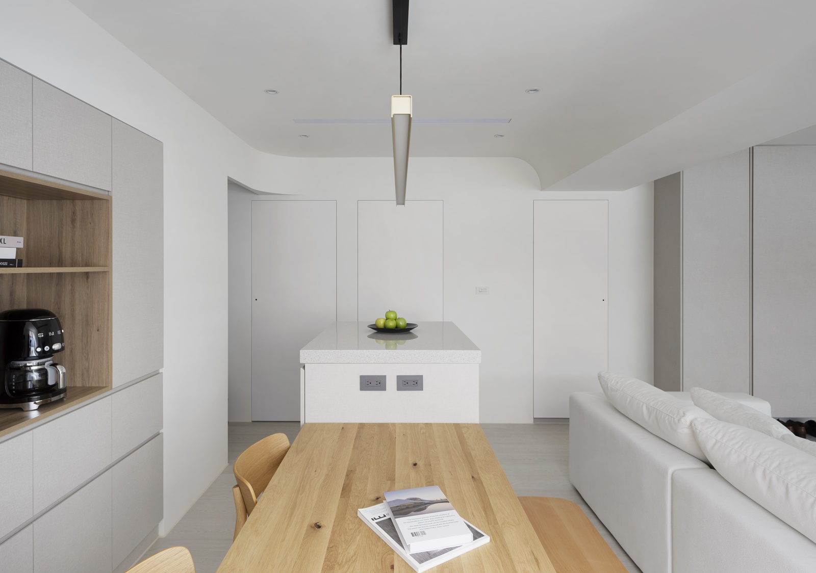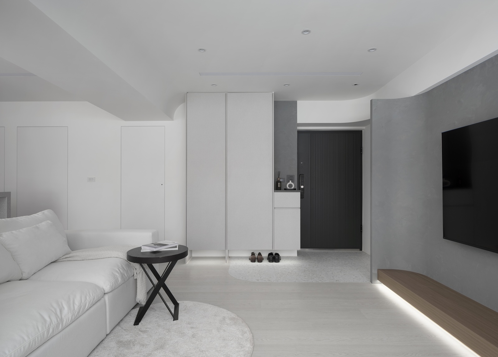 設計語彙的協調性,決定了視野乾淨度與直覺的空間感受,因此避免不必要的裝飾性和濃重色彩、繁複材質堆砌,成為規劃此案的核心思考。玄關地坪選用磚鋪設,形似水磨石質地與平接木地板柔弧過渡,配合電視主牆立體左弧旋造型,既能象徵性劃分裡外;也低調帶出歡迎回家的潛台詞。考量屋高有限,為爭取最佳淨高,全區天花板純白打底不作堆疊包覆,僅在沙發上方中貫橫樑兩側,以漸昇弧度上揚並延伸至邊緣收尾,除了空間骨架更顯輕盈緊緻,仰角視野亦獲得相對釋放。公領域採開放佈局,灰階塗料施作的電視牆、白色沙發與中島餐桌軸線三者比重均衡,整體散發寧靜淡雅的迷人氛圍。而看似極簡的木質電視低檯還內藏文章,檯面密合蓋板可掀開置放視聽設備與線路,常保不見贅述的秩序美。