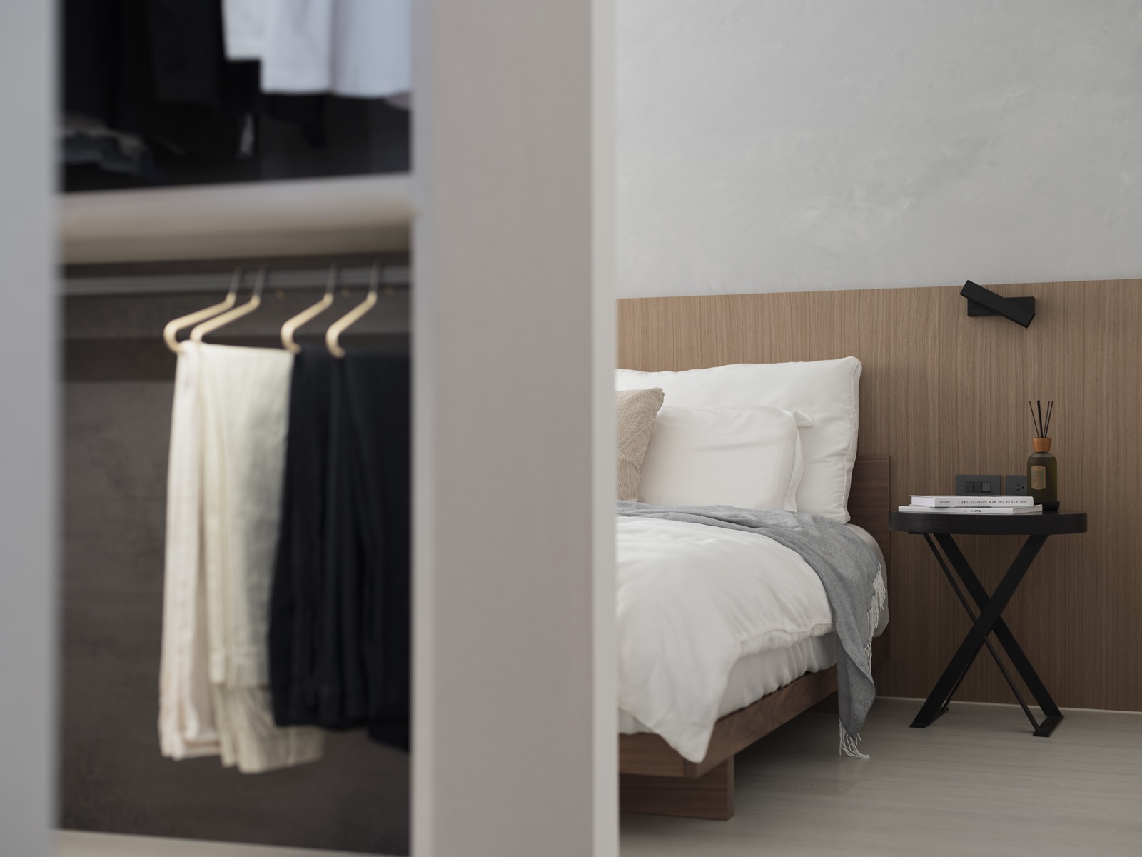 行經客廳、餐廳通往廚房的動線沿途,實際上也是全宅最長跨距連續面所在,從玄關高低鞋櫃起始,加上多達三扇極細緻的線性門框整合,分別連通客浴、儲藏間和主臥室,這樣的設計不僅弱化動線交匯的雜亂感,同時起到適度保護隱私效果,過道本身也能隨機融入不同場域重複被使用,堪稱一舉數得。此外,擁有高低錯層特性的中島餐桌軸線周邊,自然形成便於接待三五好友的循環聚落,可站可坐的隨性與悠閒引人駐足,家特有的鬆弛魅力無所不在。主臥延續灰階與暖木質共構;日式無印與現代簡約交融的舒緩質地最能紓壓療癒,床尾處特地安排步入式更衣間,滿足隆重且井然有序的衣飾收納。欣賞此案,不難發現機能與感官間,親暱互動與整體感同等重要,成舍設計團隊更把超越實際坪數的開闊既視,當作完整提案的一部份,加上傢俱軟裝與氛圍搭配得宜,彷彿齊聲讚揚著個性與品味並存的全新生活模式。