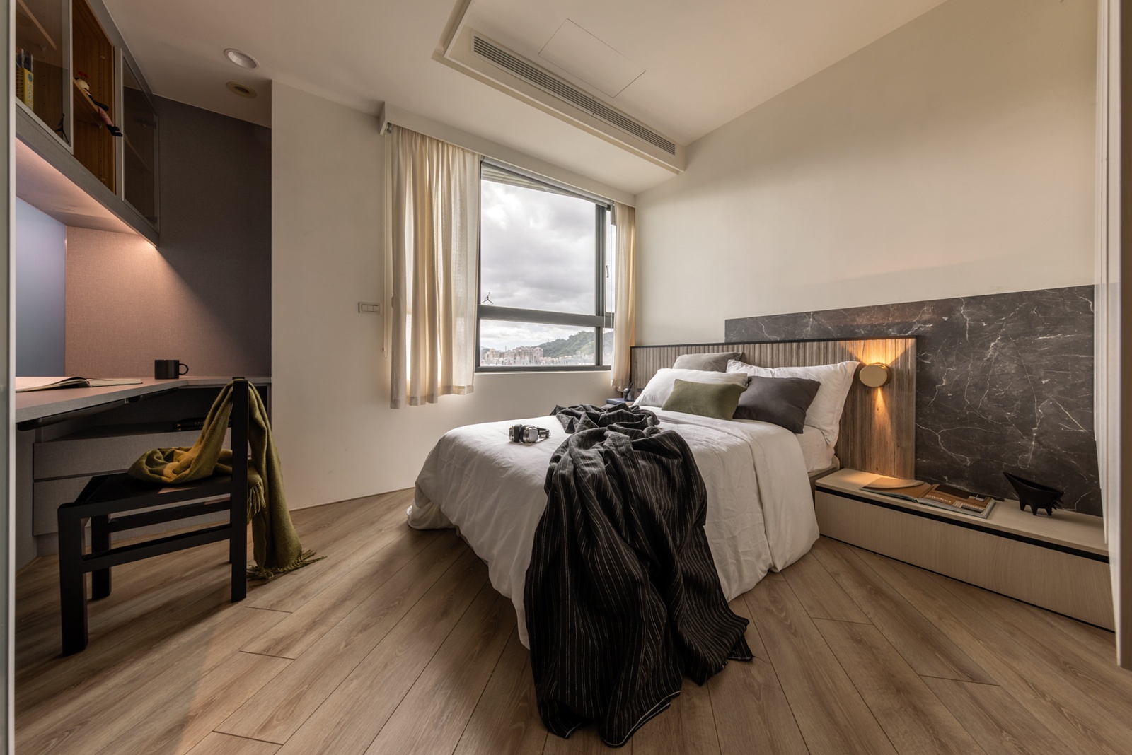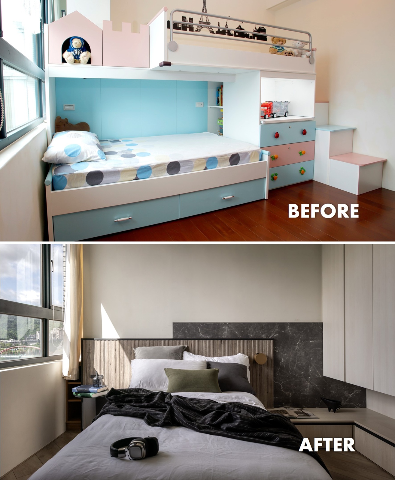 臥眠區則將原先的上下舖拆除後,重整配置。新增淺色系衣櫃與懸吊式設計,讓視覺更輕盈,下方抽屜搭配 L 型檯面,勾勒細緻的黑色線條,大幅提升衣物與雜物的收納,更巧妙形成床邊平台,讓原本的畸零角落轉化為實用區。