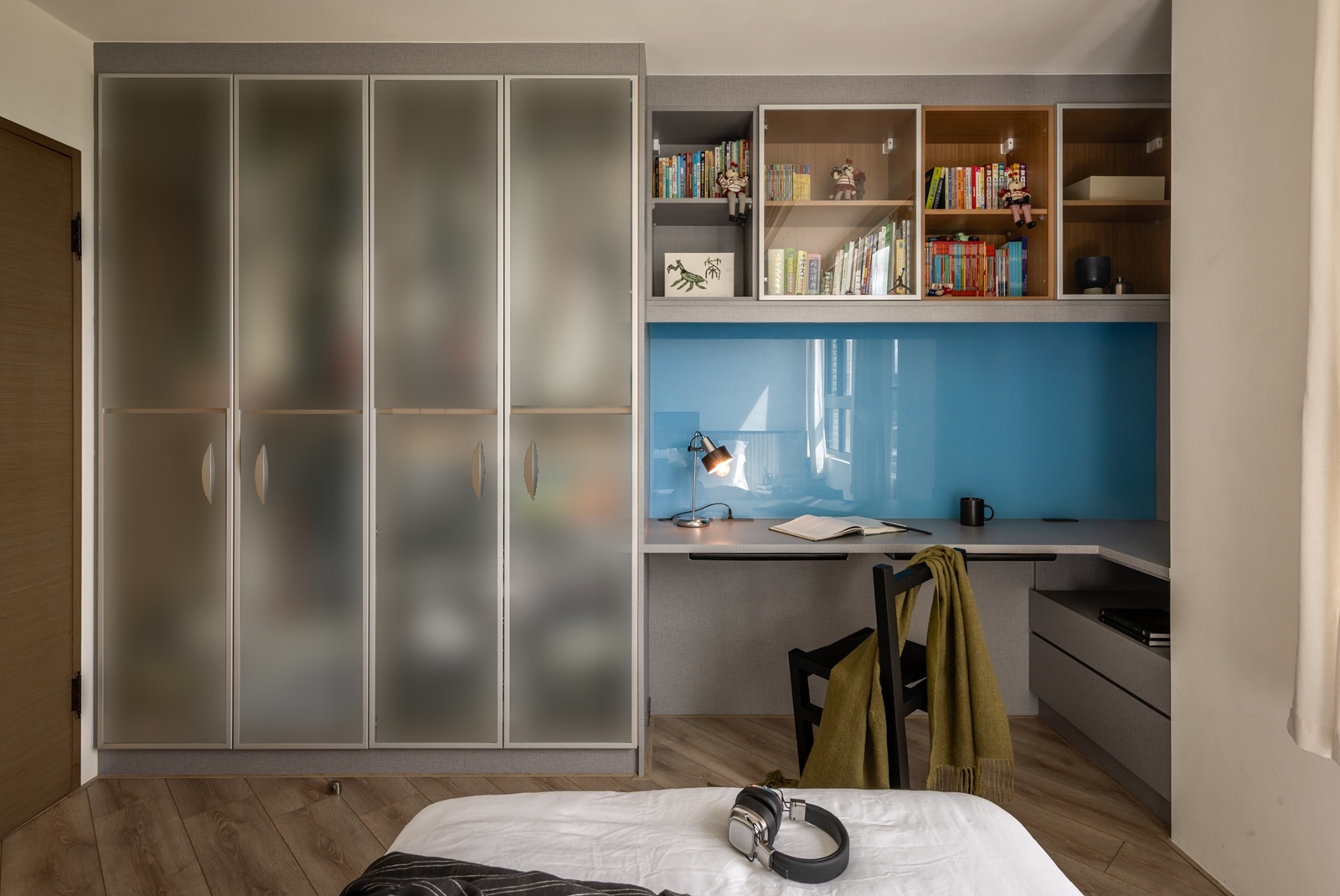 這次改造以「結合舊櫃、功能升級、沉穩內斂、提高收納」為核心。原有的歐德系統櫃歷久彌新、堅固耐用,以環保永續為前提下,將新舊櫃巧妙整合再利用。閱讀區透過縮減舊衣櫃尺度,換來更大、更深的書桌檯面,適合親子共讀與討論;背板延續烤漆玻璃,可以書寫及張貼便條紙,融合木質、灰調、中性色,營造舒適溫暖的學習環境。