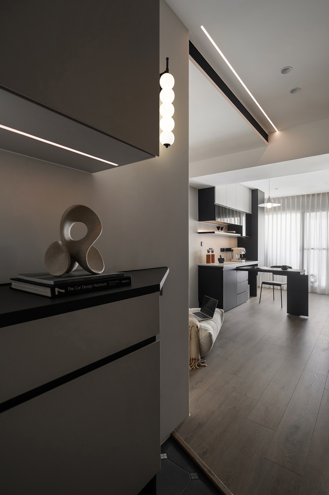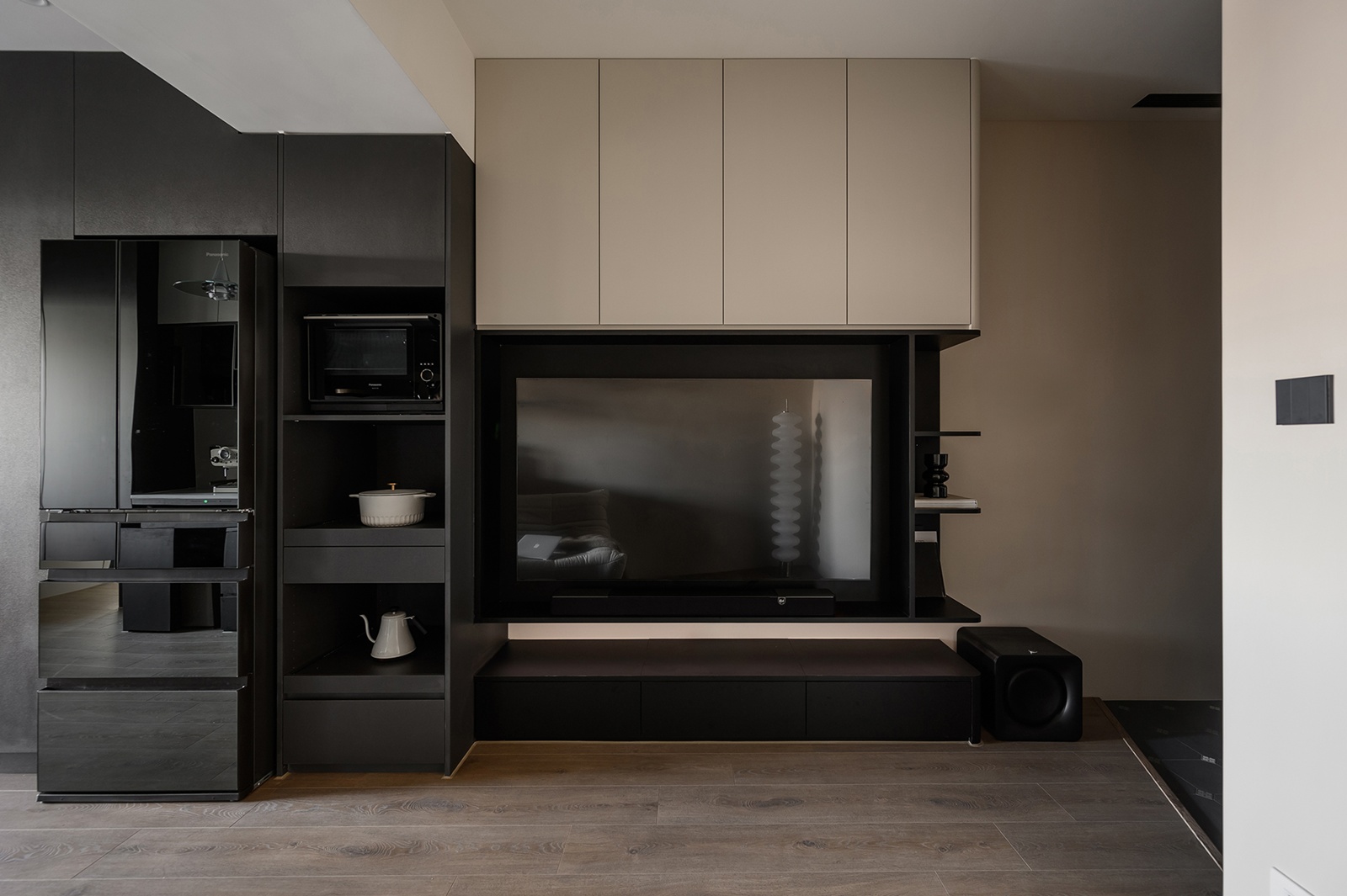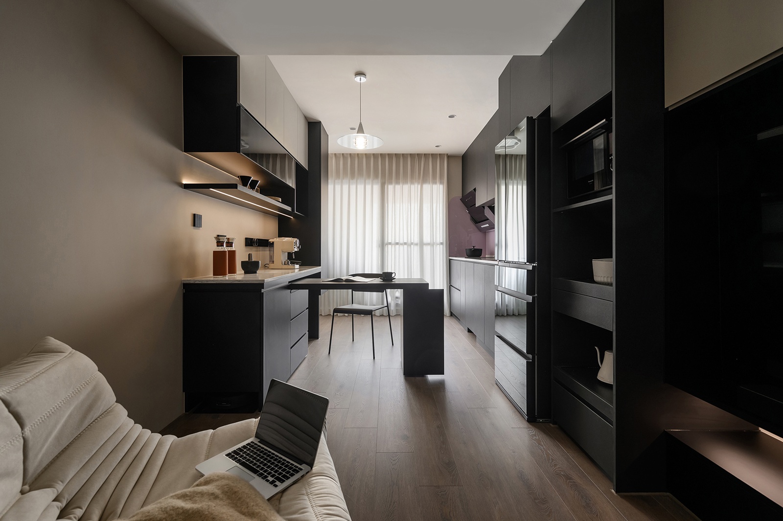 本案榮獲 2026 日本東京設計獎 Tokyo Design Awards – 金獎 。本案為小型住宅設計,旨在打造富有生活光影的溫暖居所。以屋主偏愛的暗黑色系為主軸,運用黑、米灰與木質構築沉穩溫潤的MCM語彙。選用霧面櫃體、石材檯面與金屬細節,透過材料肌理與層次照明,使深色空間兼具溫度與秩序。櫃體與牆面轉角以倒R角修飾,並以跳色與軟裝點綴視覺焦點,整體線條柔和、個性鮮明且保持平衡。
