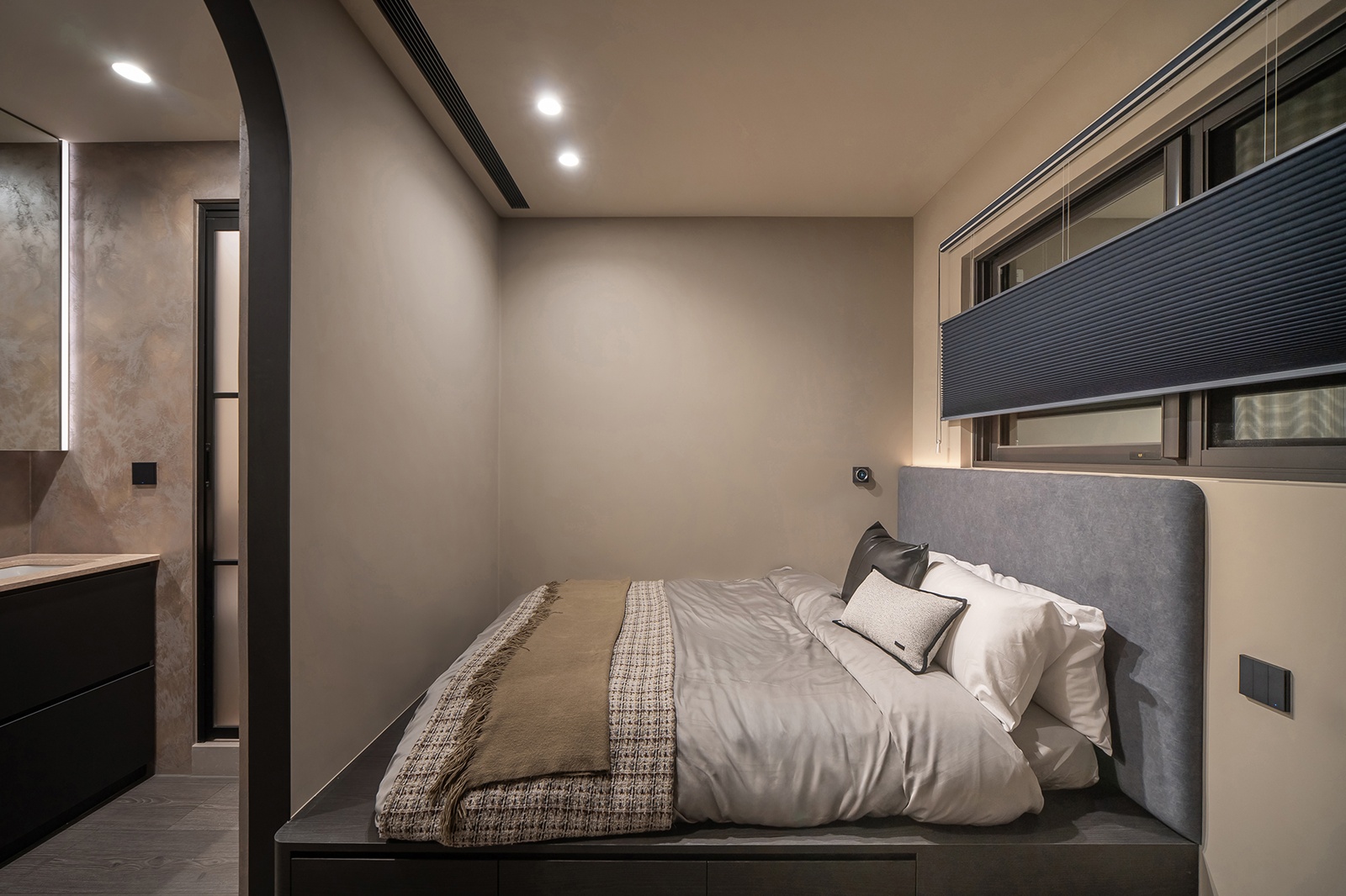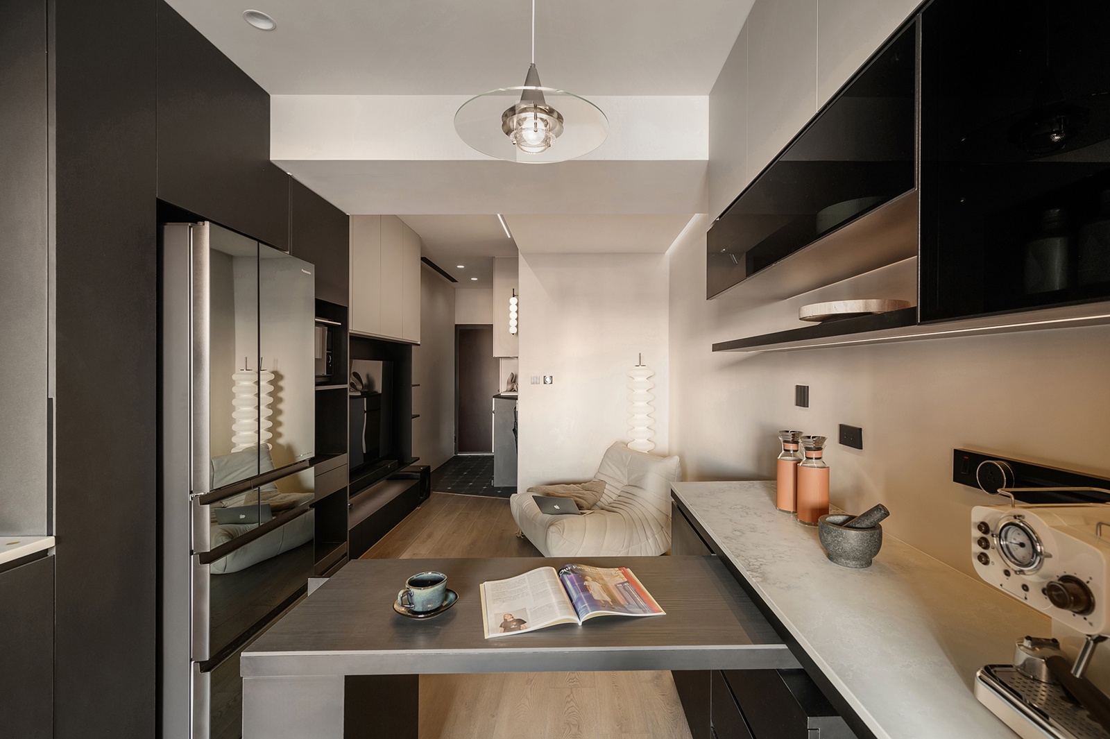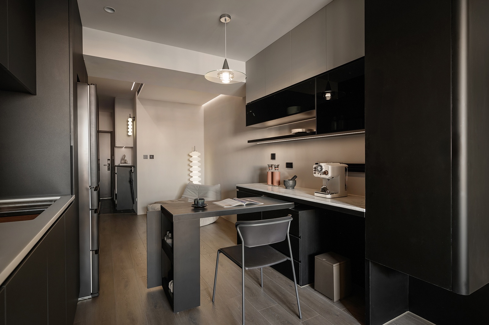 本案榮獲 2026 日本東京設計獎 Tokyo Design Awards – 金獎 。本案為小型住宅設計,旨在打造富有生活光影的溫暖居所。以屋主偏愛的暗黑色系為主軸,運用黑、米灰與木質構築沉穩溫潤的MCM語彙。選用霧面櫃體、石材檯面與金屬細節,透過材料肌理與層次照明,使深色空間兼具溫度與秩序。櫃體與牆面轉角以倒R角修飾,並以跳色與軟裝點綴視覺焦點,整體線條柔和、個性鮮明且保持平衡。