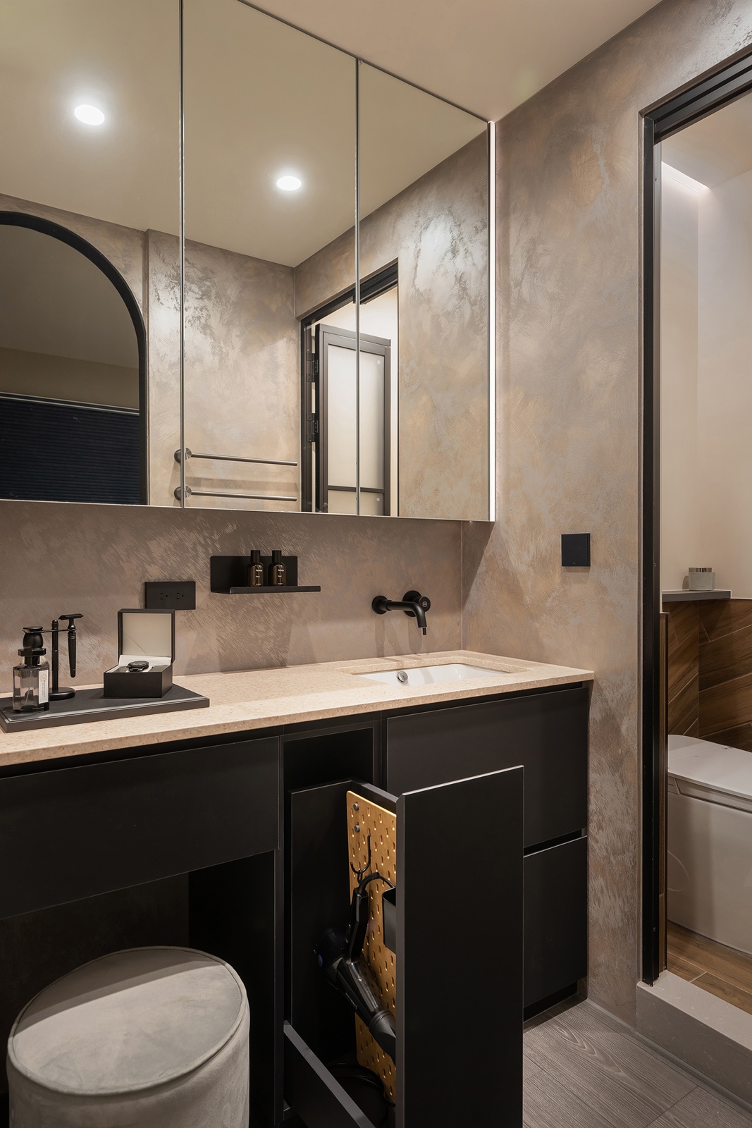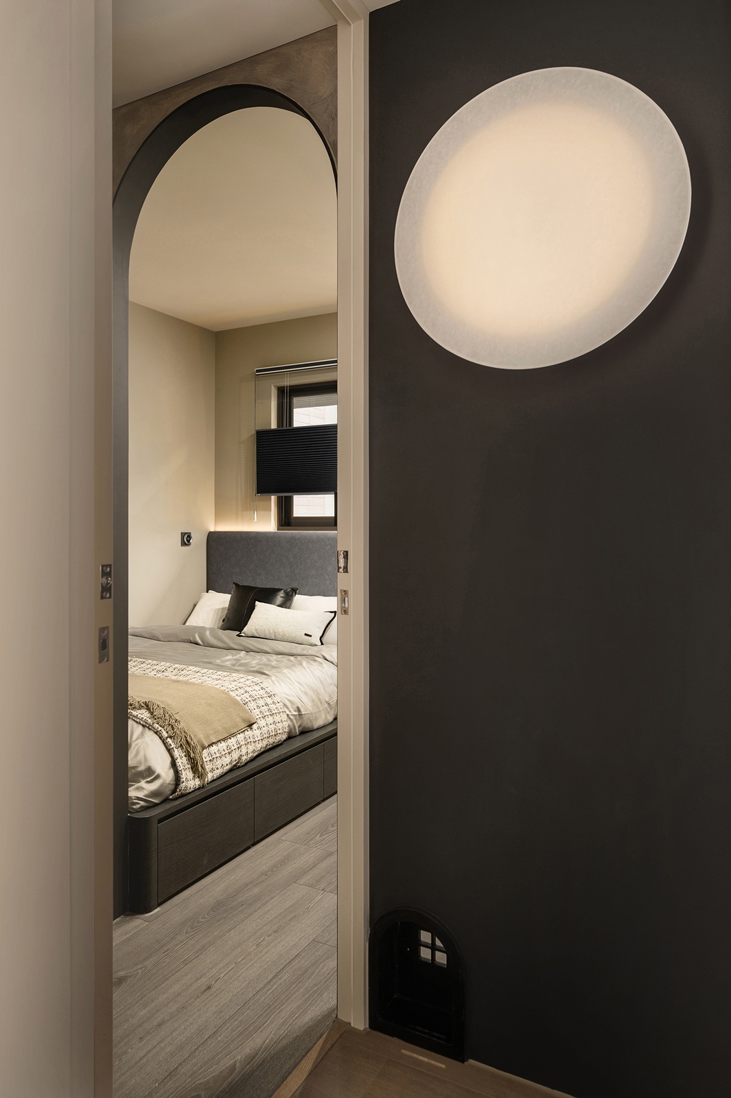 走廊端景以黑牆與圓形壁燈相映,如夜空中一輪明月,同時設置貓門方便貓咪自由穿梭。主臥透過開放式層架與架高床提升收納彈性,與浴室以拱形開口自然過渡。洗手台結合化妝桌的配置,搭配藝術漆牆面,營造柔和光感與細膩質地。客衛浴以粉色水磨石搭配銀色五金,展現清爽俐落的復古氣息。
