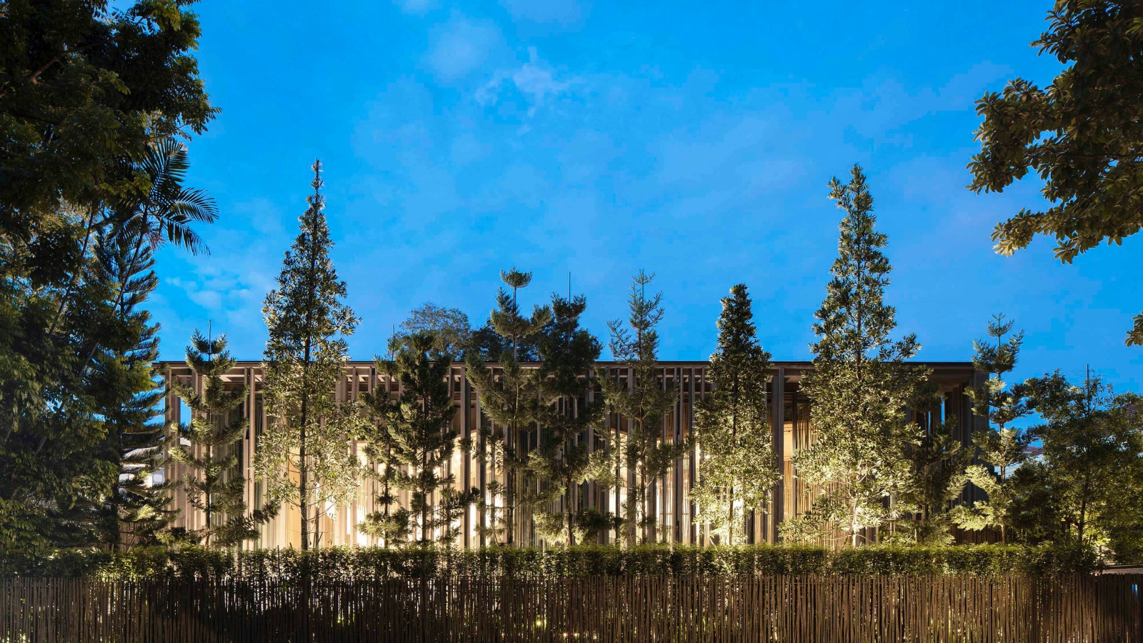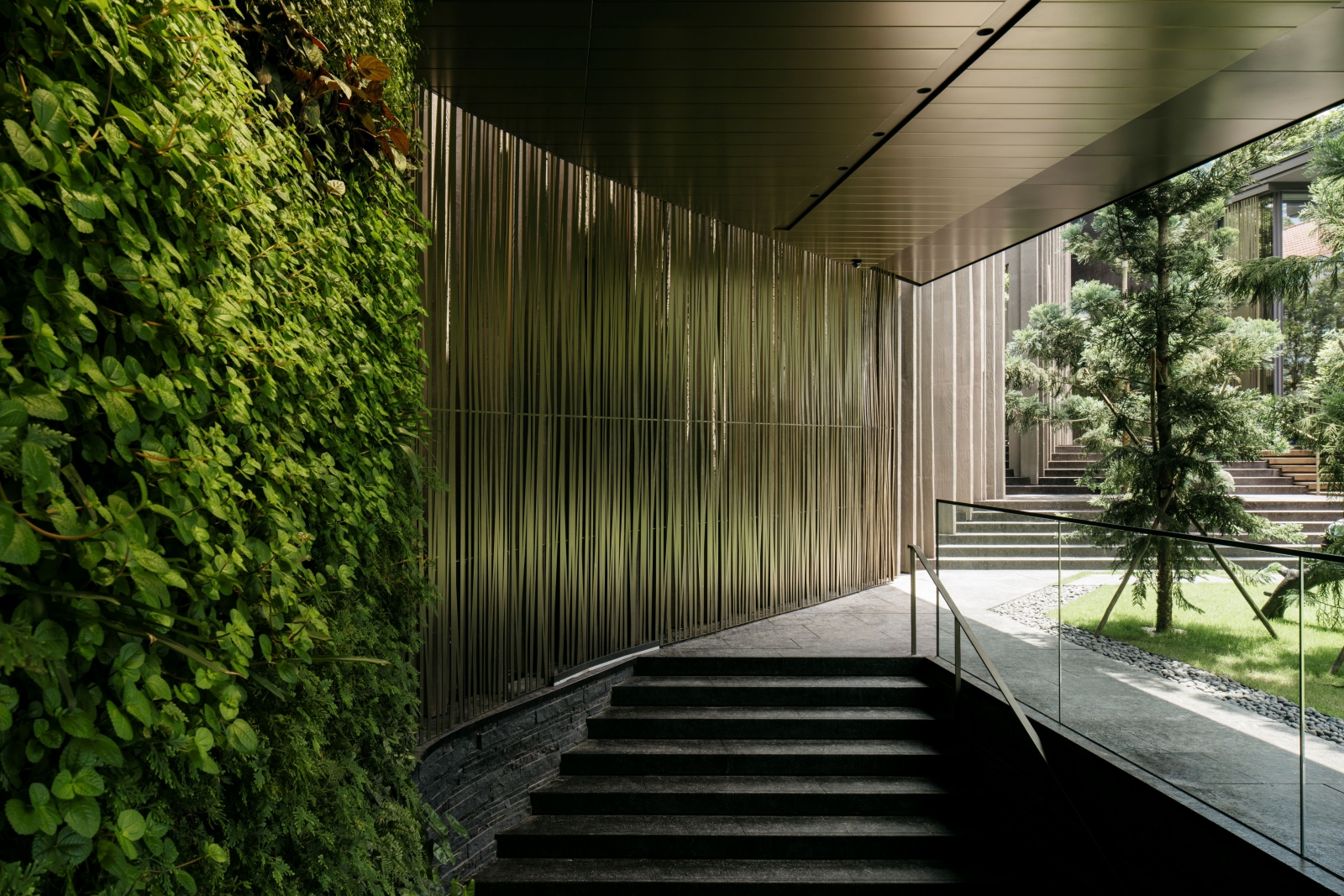 Its monumental pavilion borders the street, resembling a public structure more than a private residence. Slender vertical colonnades—each unique and placed closely together—evoke a stylized forest wall. While offering privacy, the structure also invites visual connection and dialogue with passersby and the streetscape.