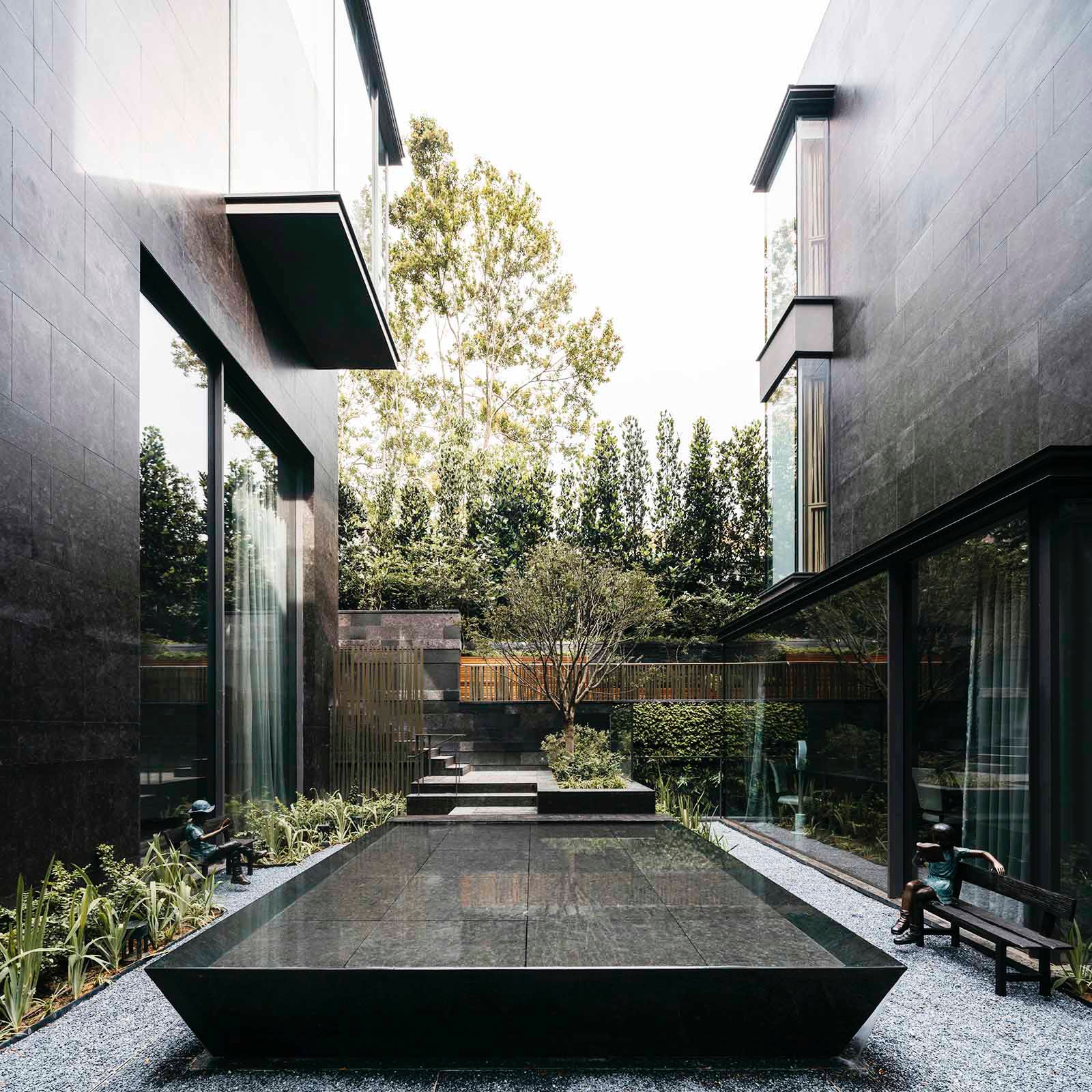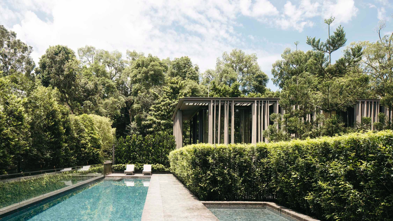 Behind the pavilion lies a private, lush garden leading to two family residences. Built into the hillside, these homes are connected yet independent, positioned to ensure uninterrupted views across Nassim Road toward the tall, dense trees beyond.