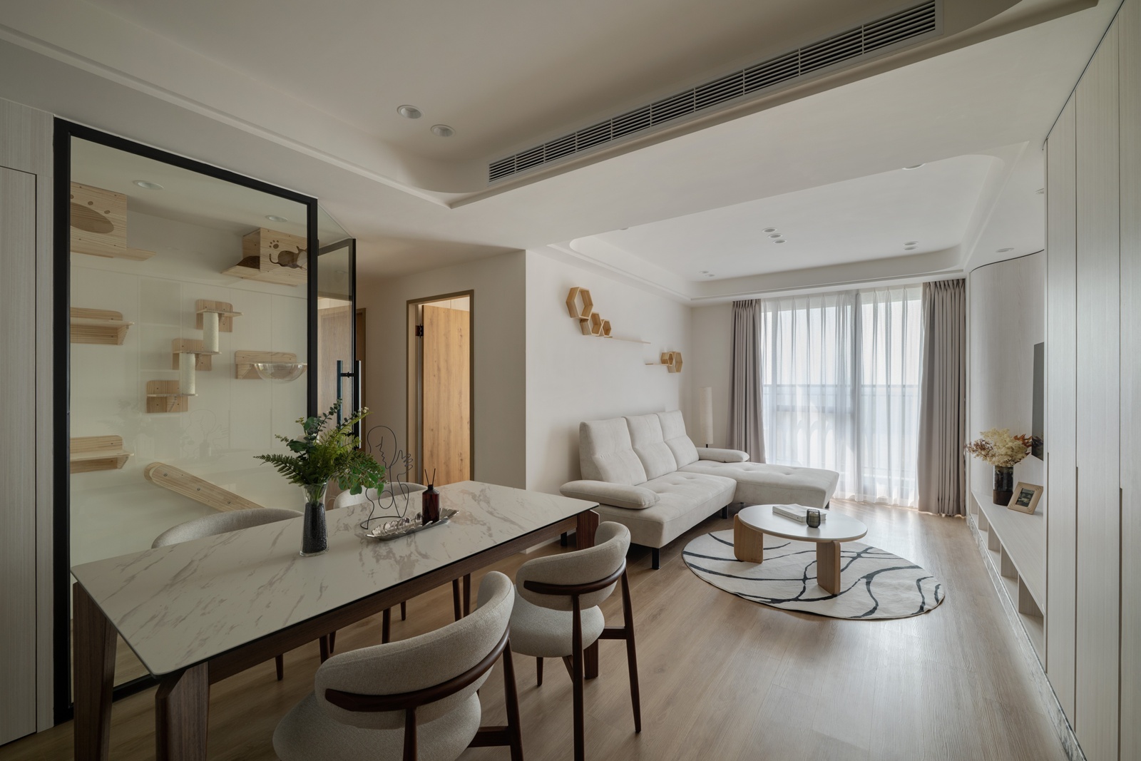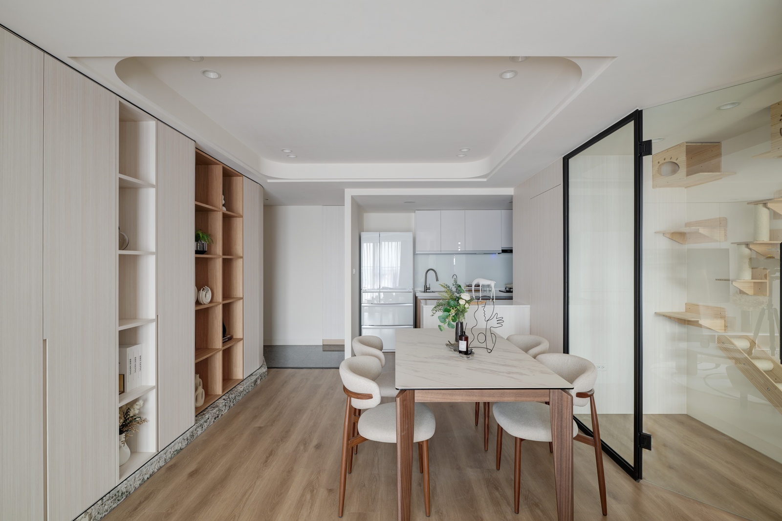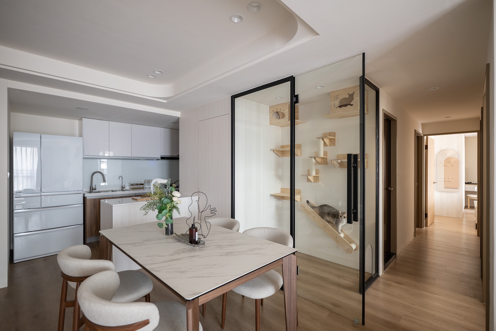 進入室內,一體成型的長型櫃從玄關延伸至餐廳再到客廳,連續圓潤曲面引導視線與動線。櫃體結合鞋櫃、餐邊櫃、電視櫃與展示端景;收納機能極大化,隱藏於無把手門片後。上下黑色描邊猶如畫龍點睛,為淺色基底增添層次。餐廳位於動線核心,石紋餐桌搭配木質桌腳,映襯北歐風柔和調性;旁側玻璃貓屋以黑色鐵件勾勒立體輪廓,透明玻璃將寵物活動區巧妙轉化為居家風景。客廳配置圓潤軟裝,沙發背牆的木層板展示收藏,使空間在秩序與生活律動間自然流轉。私領域的設計延續光影與流線美學,主臥書桌與收納櫃以圓柱支撐,窗邊延伸臥榻引景入室,創造恬靜休憩角落。兒童房則採用弧形隔板柔化書桌與床鋪界線,使光線與通透氣息自然穿透;可移動洞洞板滑開後隱藏鏡面,兼具趣味與實用。