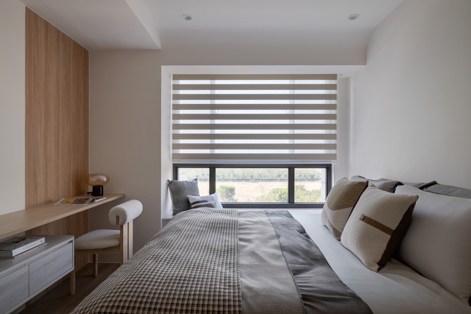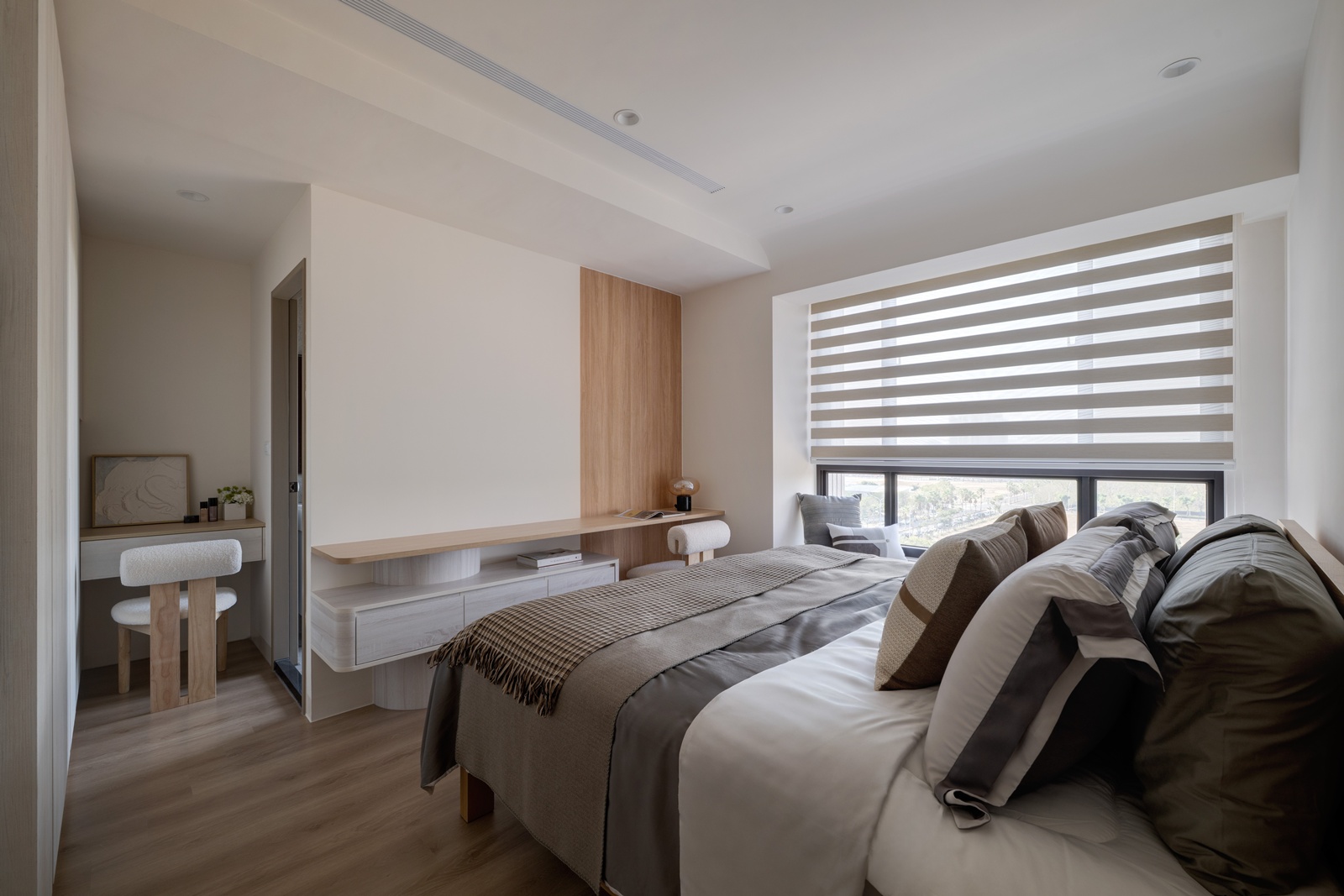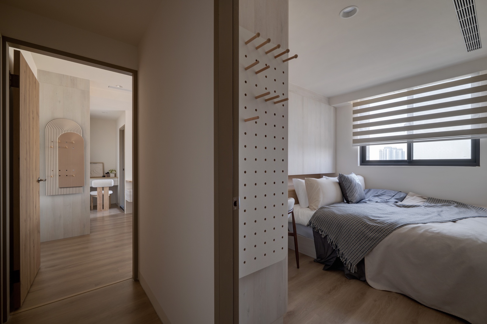 進入室內,一體成型的長型櫃從玄關延伸至餐廳再到客廳,連續圓潤曲面引導視線與動線。櫃體結合鞋櫃、餐邊櫃、電視櫃與展示端景;收納機能極大化,隱藏於無把手門片後。上下黑色描邊猶如畫龍點睛,為淺色基底增添層次。餐廳位於動線核心,石紋餐桌搭配木質桌腳,映襯北歐風柔和調性;旁側玻璃貓屋以黑色鐵件勾勒立體輪廓,透明玻璃將寵物活動區巧妙轉化為居家風景。客廳配置圓潤軟裝,沙發背牆的木層板展示收藏,使空間在秩序與生活律動間自然流轉。私領域的設計延續光影與流線美學,主臥書桌與收納櫃以圓柱支撐,窗邊延伸臥榻引景入室,創造恬靜休憩角落。兒童房則採用弧形隔板柔化書桌與床鋪界線,使光線與通透氣息自然穿透;可移動洞洞板滑開後隱藏鏡面,兼具趣味與實用。