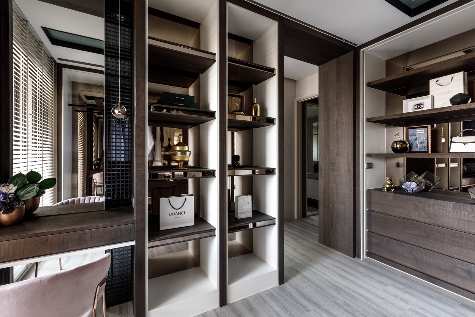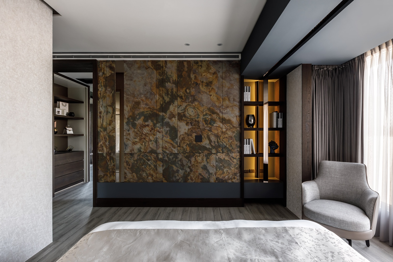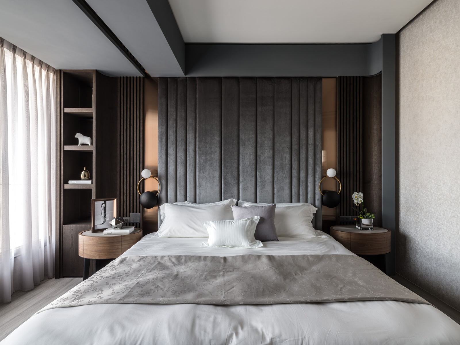 為了營造靜謐、安穩的休憩氛圍,私領域是採大地色系作為空間基底,藉由溫潤的色彩平定住戶的思緒,使其達到真正的身心放鬆。此外,因主臥擁有L型窗台配置,團隊便以極簡的場域佈局、機能設置為主,讓窗外美景成為空間的視覺焦點,為住戶的日常起居增添一份從容。