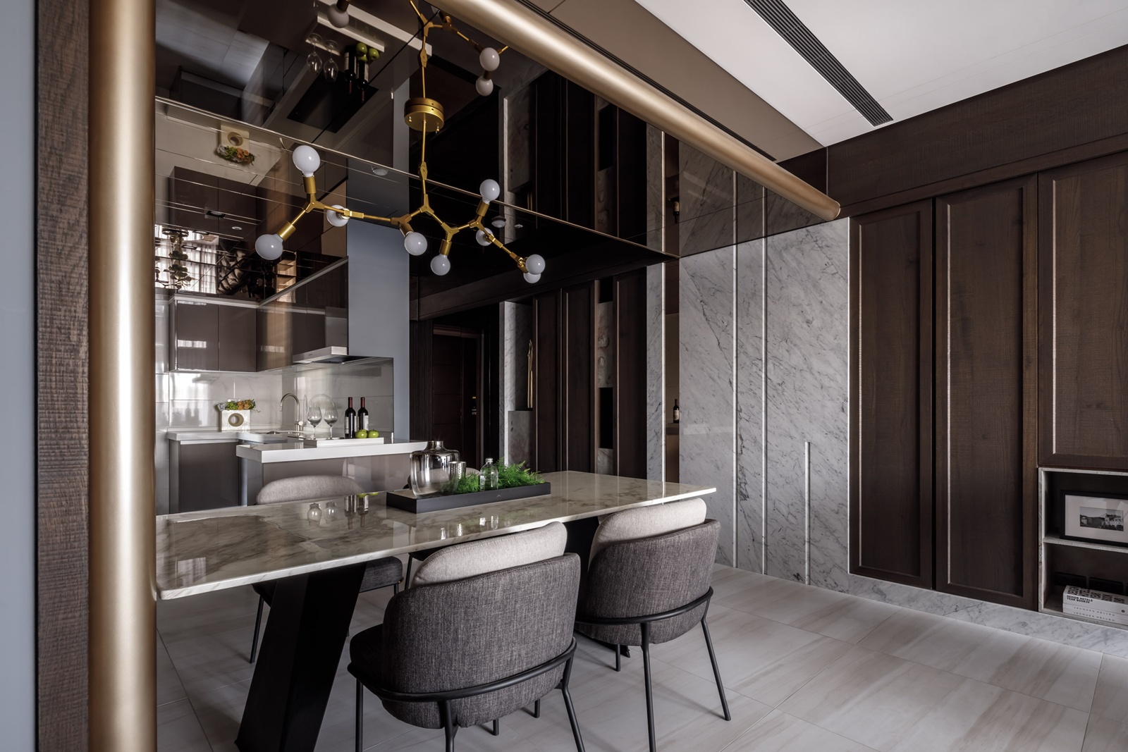 公領域內,客廳、餐廳、廚房是採無隔間設計,且三區皆規劃在同一軸線上,能讓自然光毫無阻礙地流淌於全室,解決住宅僅有單面採光而導致的內部空間昏暗之問題。其中,團隊在餐廚區的天花板有特別導入鏡面元素。這不僅能弱化客廳與餐廚區之間的高度落差,還能消弭低矮天花板帶來的壓迫感。另外,展示櫃的背板也同樣採用了鏡面設計,可在提供收納機能之餘,避免空間畫面顯得厚重、雜亂。