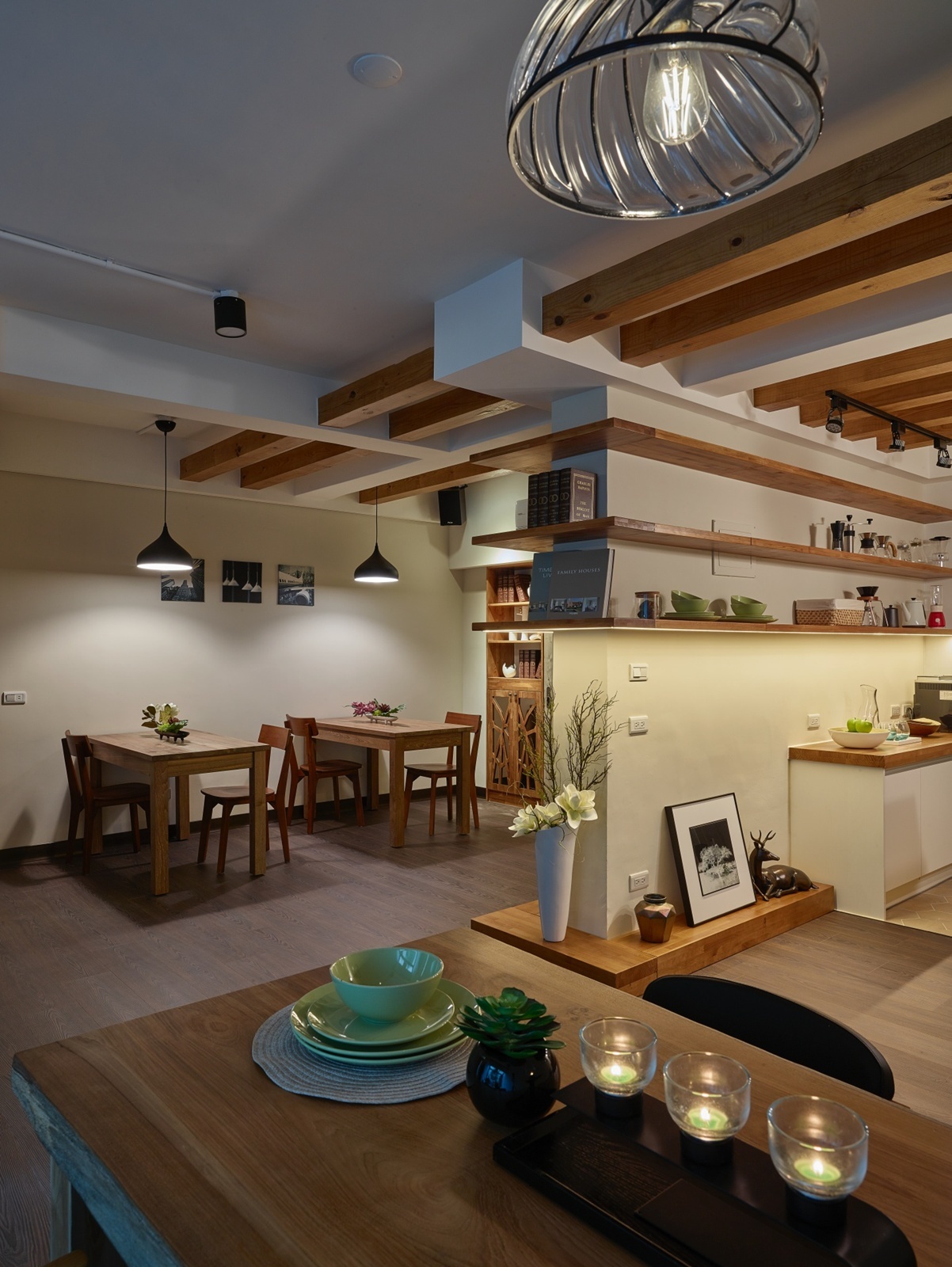 - 實木質感:餐廳與吧台延續木頭基調,融合開放展示與收納,呈現統一美感。