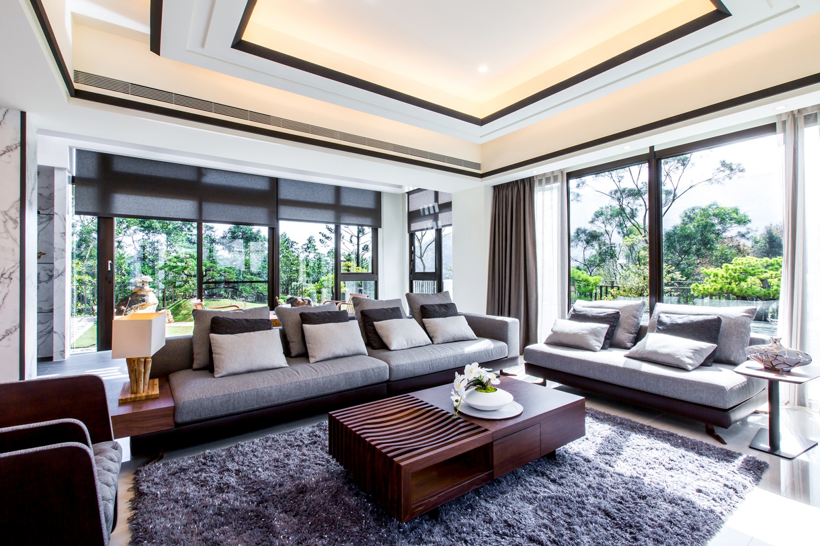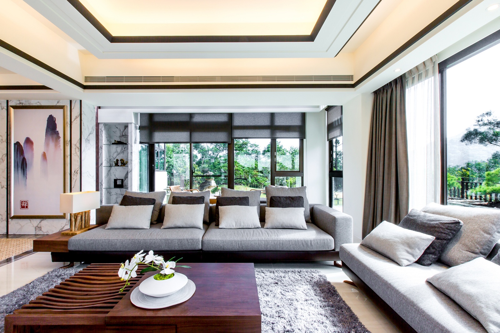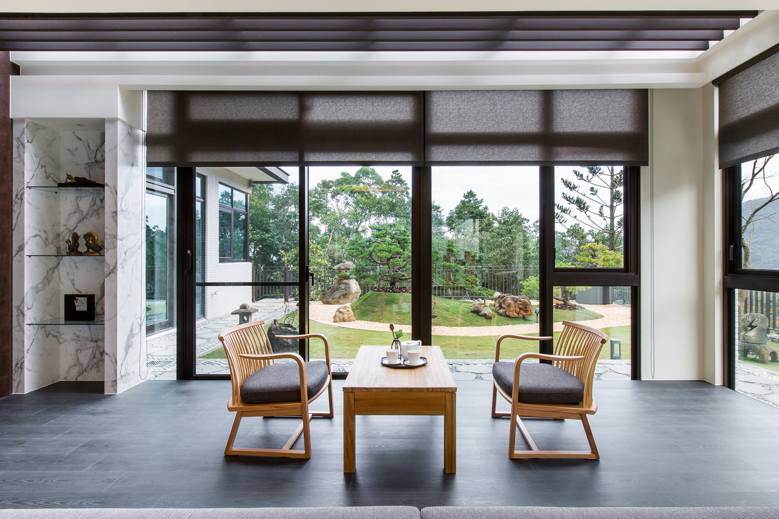 本案座落於山區的四層樓度假別墅,設計師利用其得天獨厚的基地條件,在各場域規劃大片景觀窗,並妥善安排格局,讓陽光和蒼翠的大山景致得以毫無阻礙地援引入室。整體設計融合台北室內設計公司對高端生活的細膩洞察,以日式古樸、禪風為主軸,結合京都園藝造景,為居住者形塑出一處不出國門亦能徜徉於古樸、恬靜的居所。