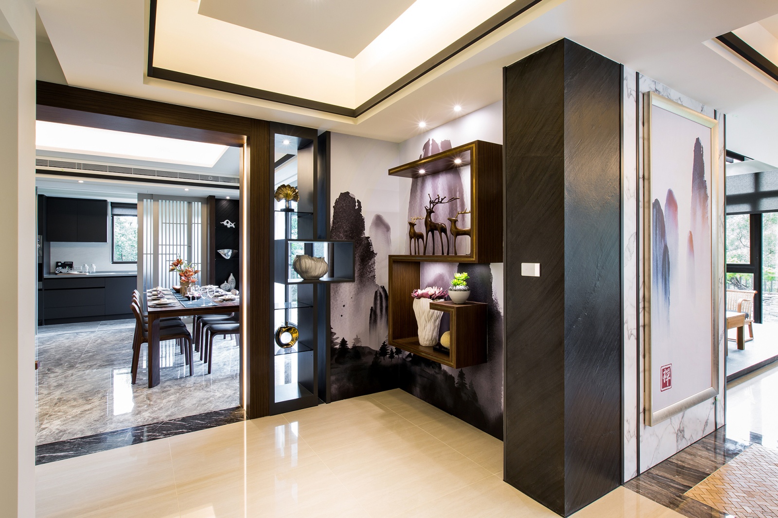 - 隱秀宴會:二樓宴會廳以藝術牆隱藏收納功能,將實用藏匿於美感之後,極大化空間的視覺感受。