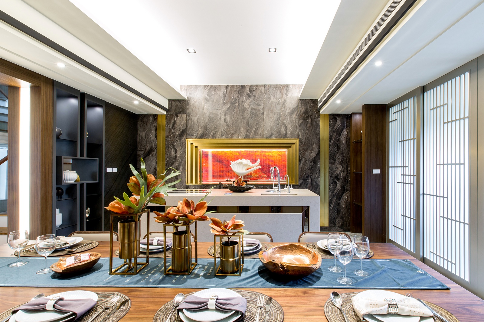 - 流暢饗宴:寬敞明亮的宴會廳動線將洗手槽、冰箱及酒窖整合於側,讓服務動線流暢而優雅。