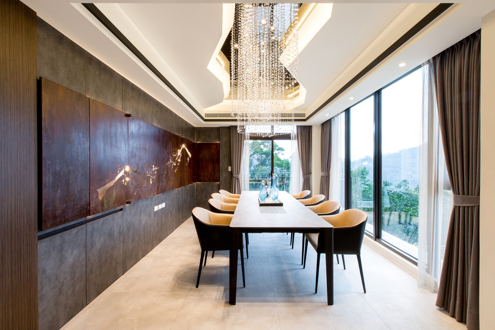 - 山巒意象:客廳窗前以霞光玻璃與鐵件重巒疊嶂,與窗外真實的山景相呼應,虛實相生。