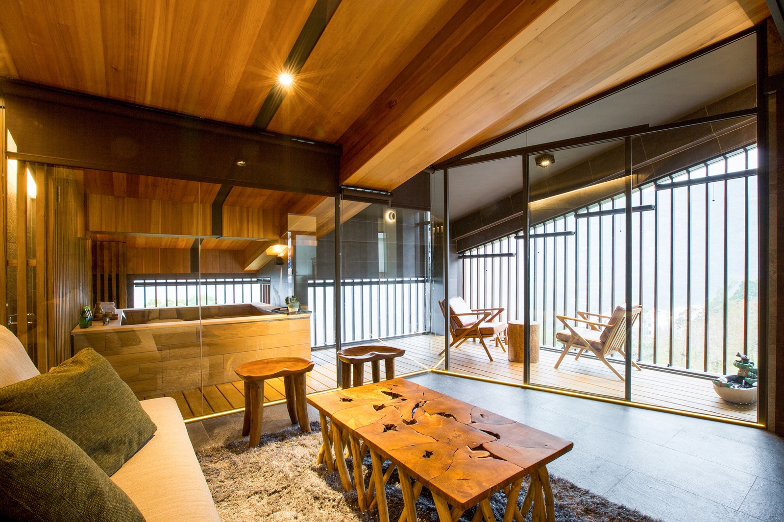 這是一處真正能讓靈魂棲息的場所,設計團隊不僅是在創造空間,更是在編織一段關於寧靜的生活敘事。大片景觀窗濾掉了外界的喧囂,只留下純粹的光影在綠能建材上漫舞,無論是與親朋好友在中島旁的交談,或是獨自在半戶外湯屋的冥想,所有生活的片段都在此得到了最和諧的安放,讓這座山中別墅成為一種與自然和諧共居的理想典範。