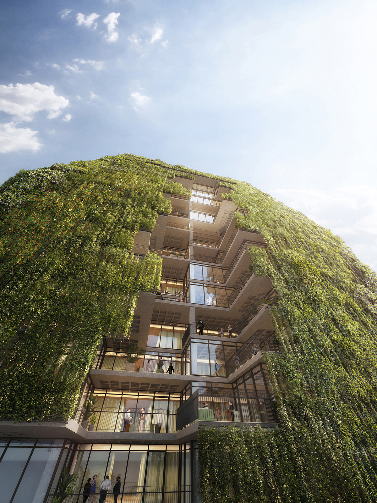 如前所述,將自然融入建築帶來無數益處,而本案採用的模組化屋簷與攀緣植物系統亦展現創新精神:建築將種植10種攀緣植物,隨季節變化呈現不斷更新的景致;與多數綠化立面不同,這裡並非以磚石為基底的綠牆,而是讓攀緣植物攀附於純淨的玻璃幕牆前,以自然濾光重塑舒適宜人的工作氛圍,其靈感源自亞馬遜雨林樹冠中灑落的陽光。從各處工作空間望向外部,城市天際線與藤蔓濾過的光影交織成獨特風景。