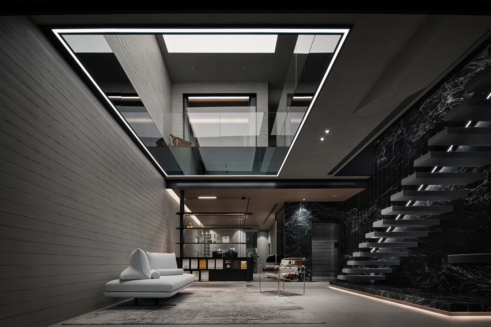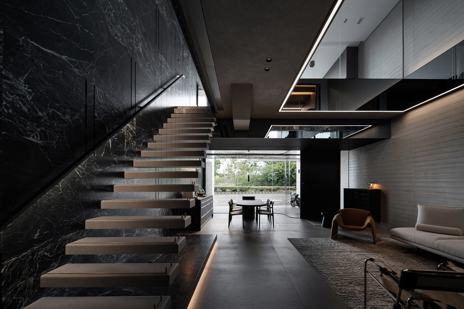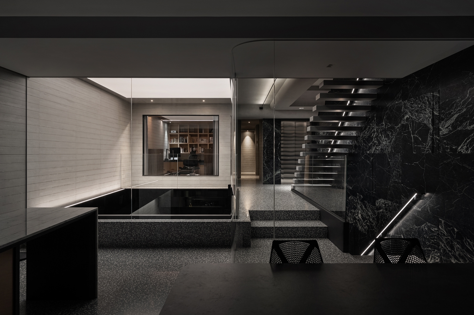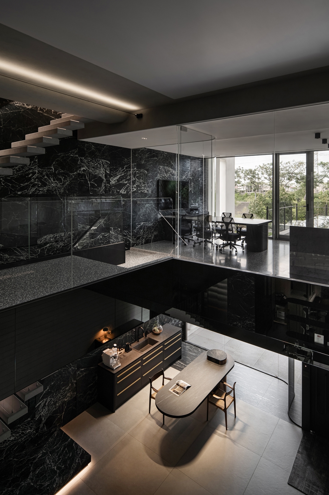 團隊藉蛇紋石結合隱藏鋼製層板,形塑兼具展示與待客的迎賓場域;懸浮鋼構接待桌以薄板結構延展輕盈姿態,創造從容的場域調性。中央天井透過鏡面與線燈設計,引導垂直視覺延展,使光影連貫且流動。辦公區藉橡木天花搭配音響設備,勾勒沉穩專注的創作環境。此外,視線由玻璃窗延伸至天井及窗外河景,讓思緒在光影與水色間自在遊走。