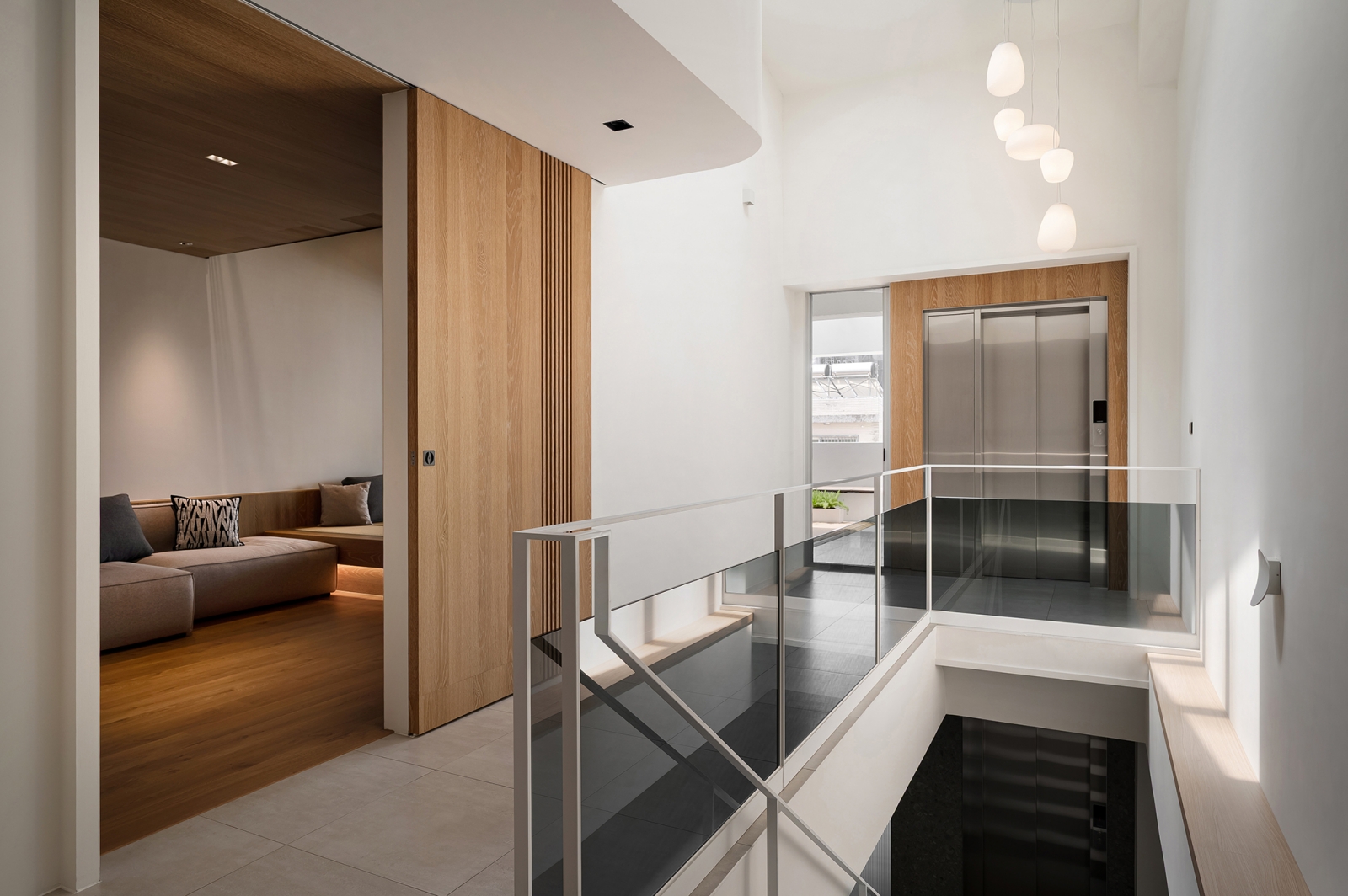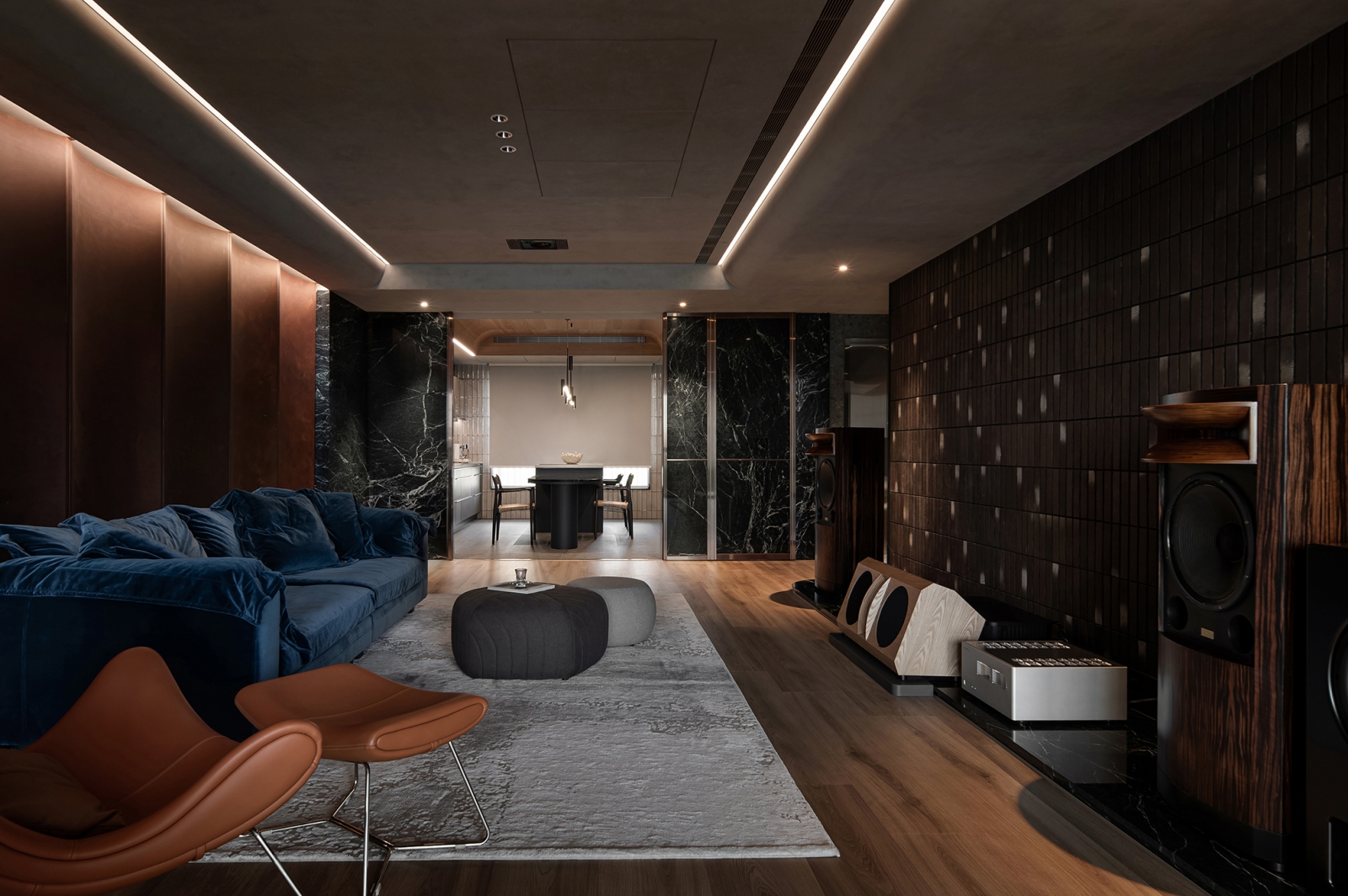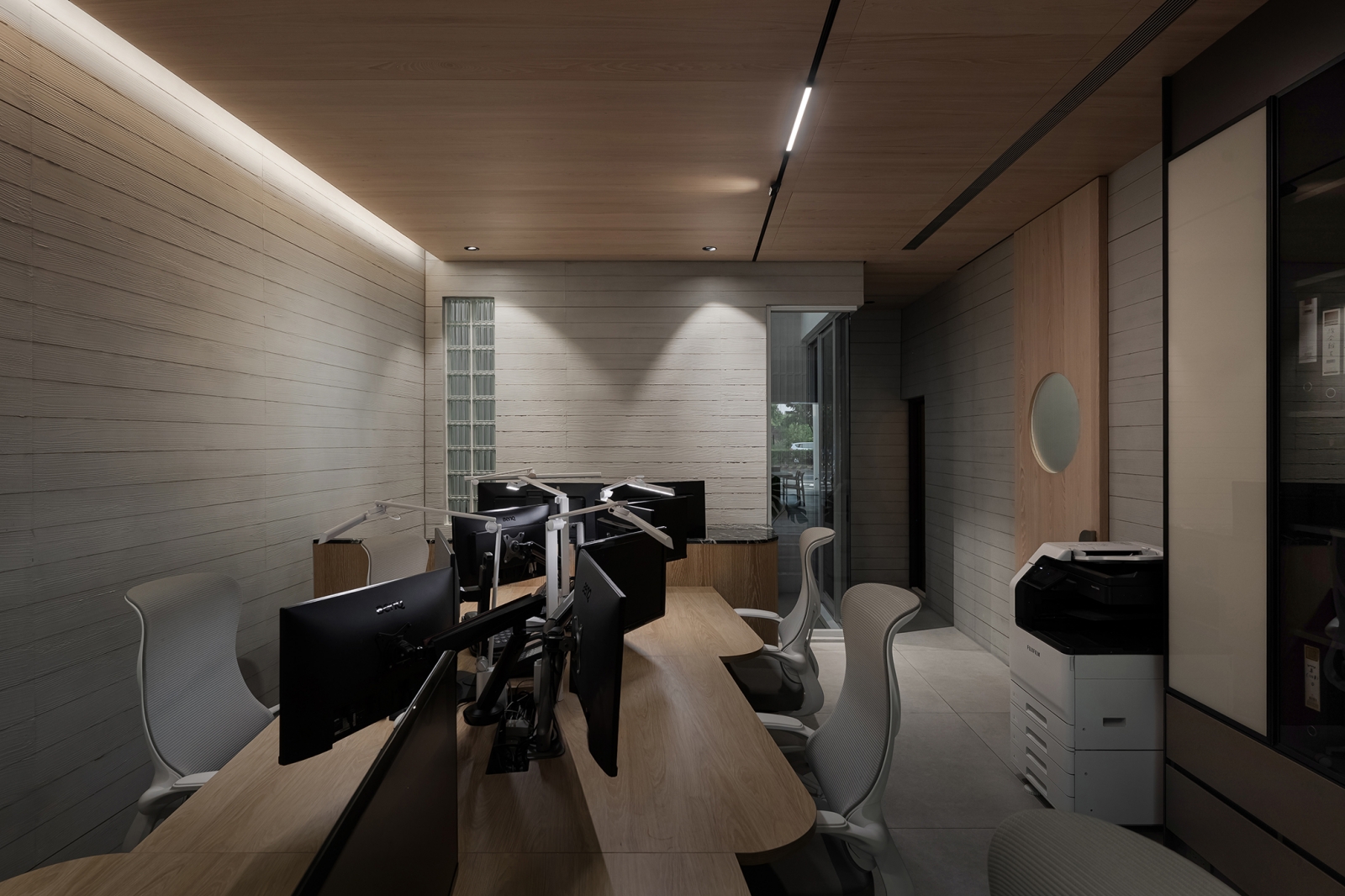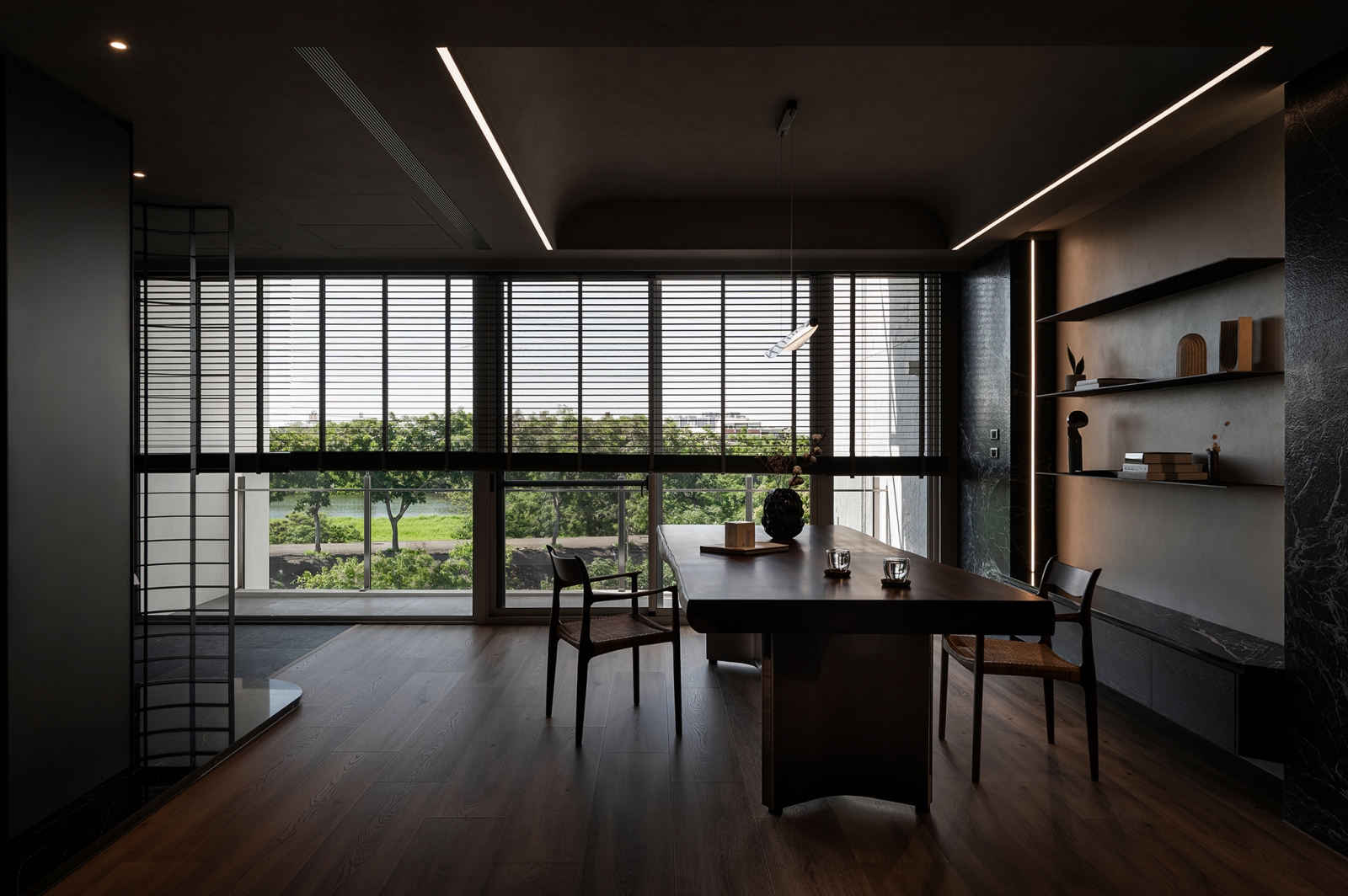 團隊藉蛇紋石結合隱藏鋼製層板,形塑兼具展示與待客的迎賓場域;懸浮鋼構接待桌以薄板結構延展輕盈姿態,創造從容的場域調性。中央天井透過鏡面與線燈設計,引導垂直視覺延展,使光影連貫且流動。辦公區藉橡木天花搭配音響設備,勾勒沉穩專注的創作環境。此外,視線由玻璃窗延伸至天井及窗外河景,讓思緒在光影與水色間自在遊走。