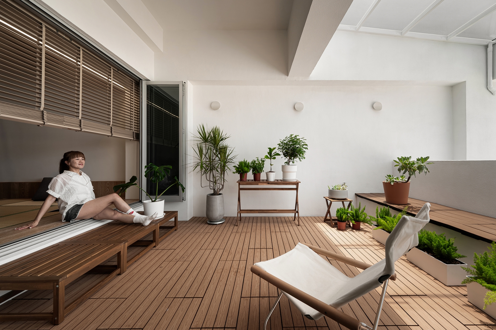 三樓作為設計師的居所,透過胡桃木桌與編藤座椅結合金屬層架,鋪陳溫潤和清透交織的場域質地。空間導入高規音響,佐以弧形結構與沉穩色階,打造沈浸的視聽體驗。四樓運用 CNC 雕刻木質天花、隱藏式洗衣設備及下沉式浴缸,形塑靜謐而細緻的休憩層次。五樓長輩房採硅藻漆與橡木為調,建立安穩的居住氛圍;和室落地折窗連結空中花園,使榻榻米區得以延攬庭景,花香與風輕柔穿梭,形塑愜意的生活氣息。
