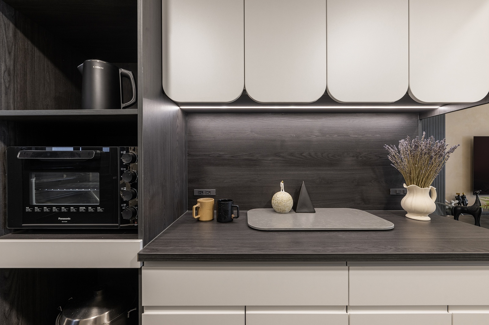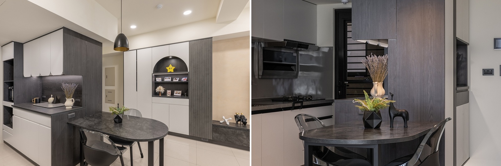 餐廚區巧妙運用玄關櫃與餐邊櫃的櫃身側面,作為餐桌依靠牆面,延伸出圓弧收邊的餐桌,同樣選用石紋系統板打造,營造兩人溫馨的餐敘時光。餐邊電器櫃則採用圓弧角度較小的造型門板,不僅避免積灰、便於清潔,也保留了圓弧細節的柔和美感。