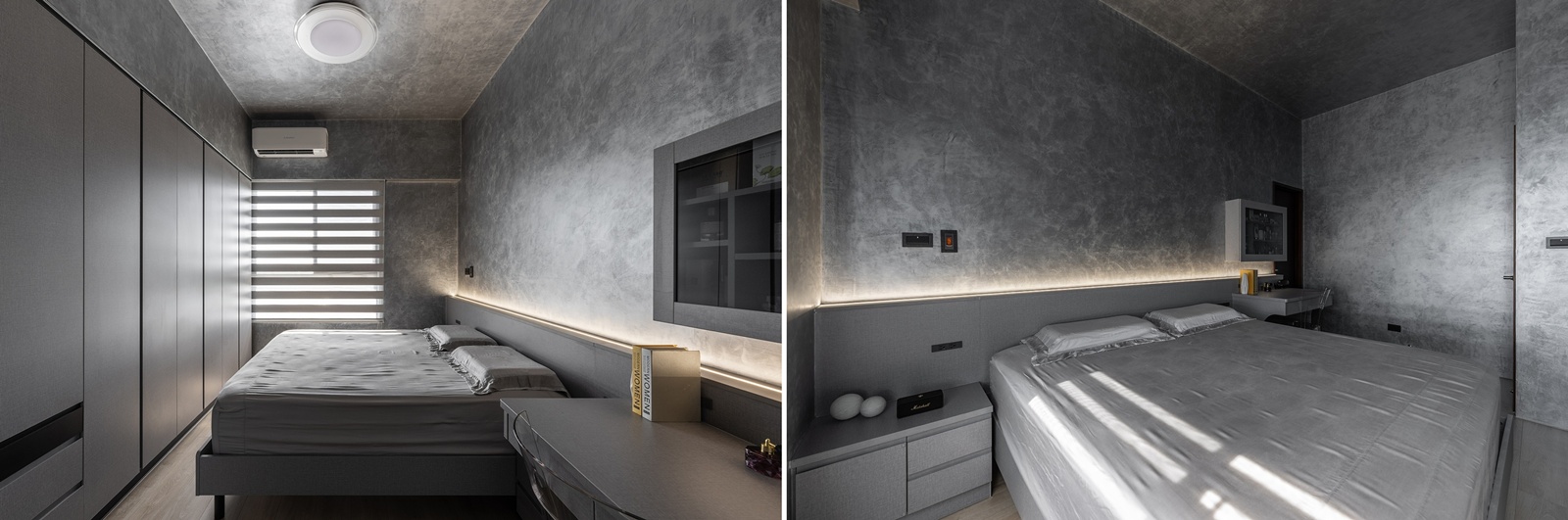燦星夜空、沈浸悠遊於銀河的浪漫情境,是主臥設計的靈感來源。天花與牆面全面施作帶有金屬光澤的手繪塗料,隨意鏝抹的筆觸自由恣意,白天呈現如清水模般靜謐的灰境質感,夜晚燈光映照下閃耀微光,帶出一絲迷人的科幻氛圍。