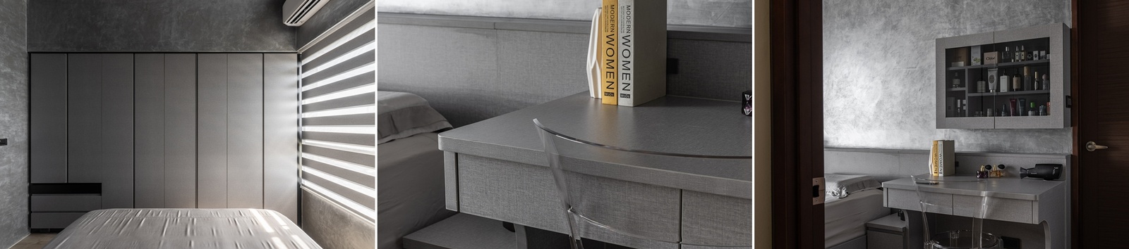 機能配置上,採用一體式設計,整合梳妝區、床頭邊機與床頭背板,以灰色布紋感的系統板串連鋪陳,色調與牆面相近,卻帶有溫潤柔和的層次感。梳妝檯上方亦貼心增設吊櫃,可收納保養品、化妝品等瓶瓶罐罐,保持檯面整潔有序之餘,也讓日常使用更加便利。