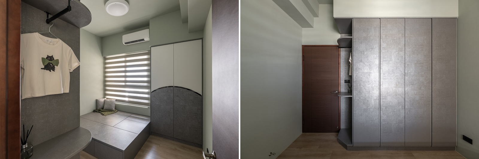 次臥房兼具客房、儲物間及男主人更衣間的功能,採用臥榻收納床,方便存放冬被與行李箱。以霧感煙灰綠為主色調,搭配客製化門板設計,依然保有豐富的層次感與獨特的設計風格。