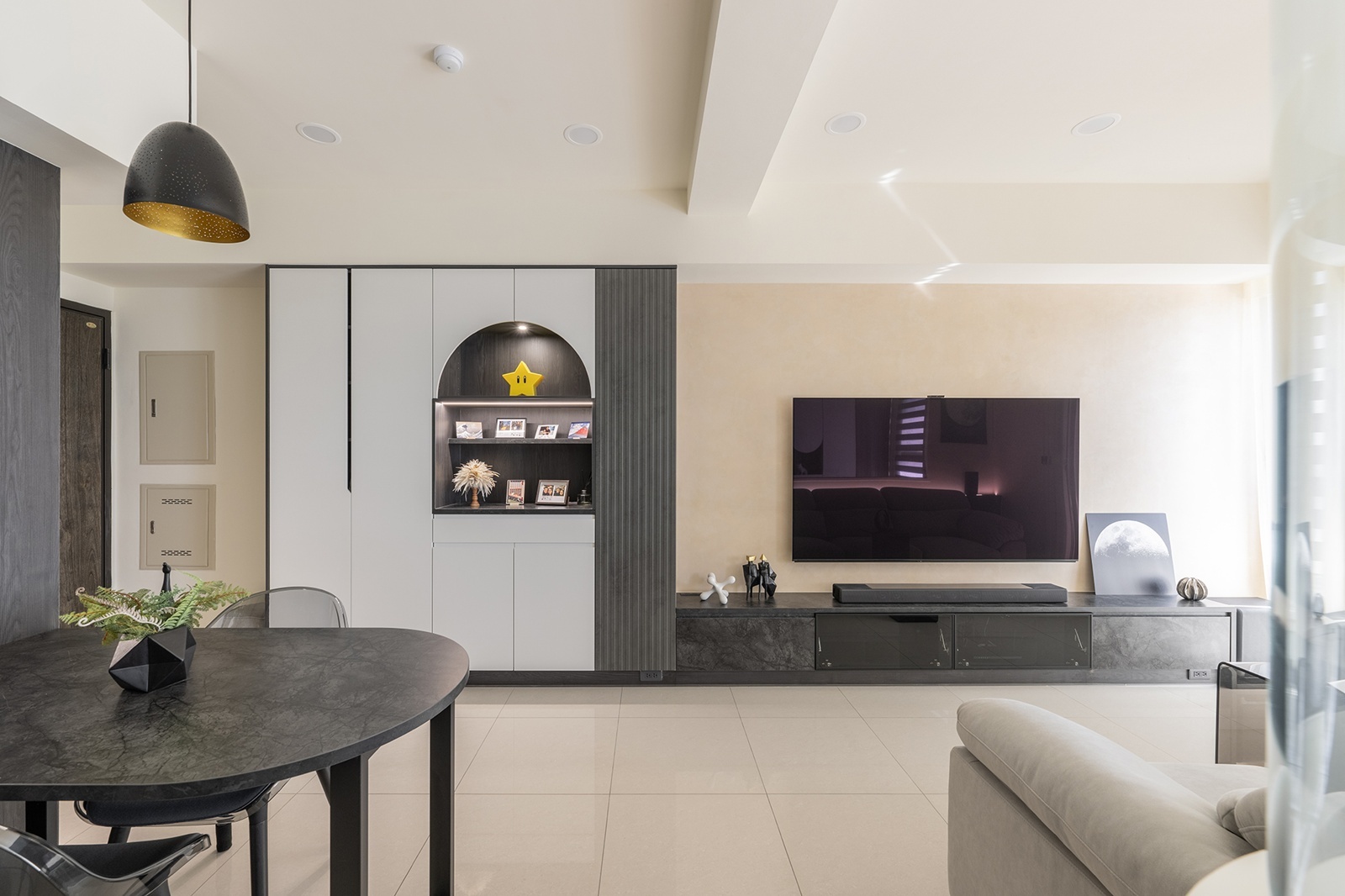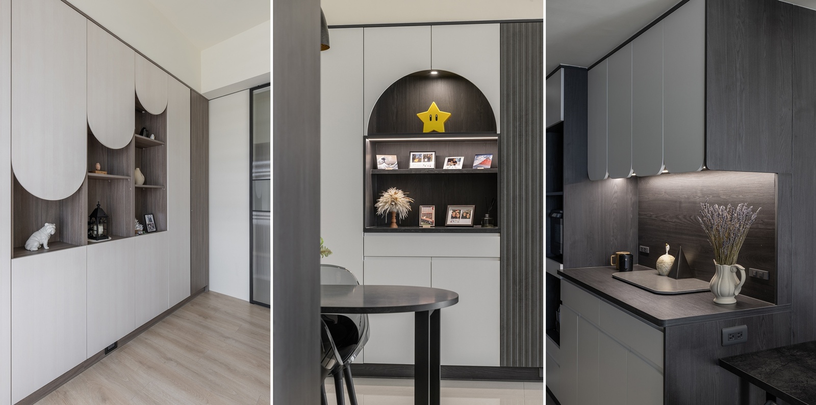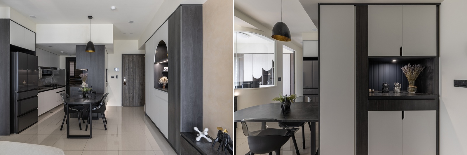 在設計師眼中,櫃體不僅是收納物品的容器,更是承載生活片段的溫柔載體。因此,在規劃中除了重視機能的實用與秩序,也期望映照出屋主夫妻之間的情感與回憶。所以在玄關端景的鞋櫃與收納櫃上,陳列旅途中帶回的紀念小物與甜蜜合影,在柔和燈光的映襯下,從一入門便能感受家所散發的溫度與情感連結。