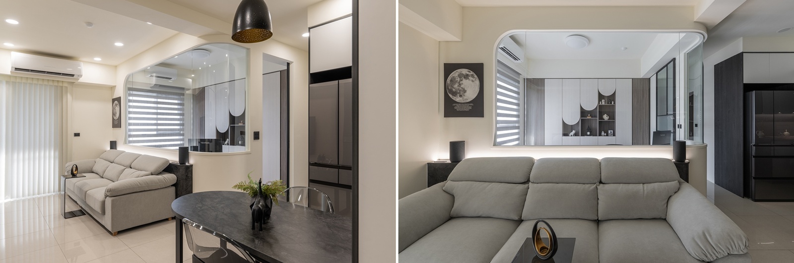 屋主偏好帶有個性的現代質感風格,整體以黑、白、灰為主色調,呈現出俐落且大膽的視覺印象。在空間中融入各種特殊造型與弧形語彙,使整體不流於單調,更展現出屋主獨有的生活態度與品味。