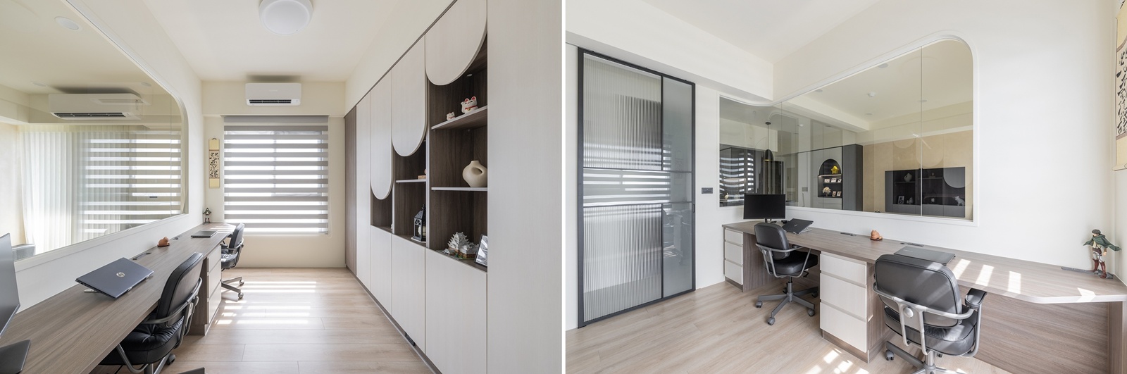 因應女主人居家辦公的需求,拆除其中一間臥房的實牆,改以玻璃隔間塑造半開放式書房。猶如行雲流水的運筆,勾勒出一方靜謐而舒心的角落;流暢的柔弧線條,亦巧妙化解橫梁銳角,讓整體視覺更加柔和圓潤。