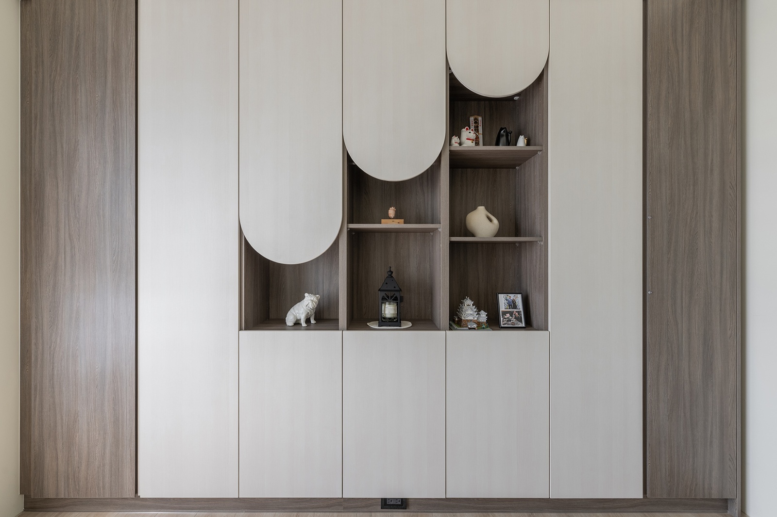展示櫃一路延伸銜接至電視機櫃,擴大了整體儲物機能,也整合日常備品的收納需求。其中巧妙穿插圓拱造型端景與光源點綴,在機能之間注入柔和的視覺節奏,增添溫潤的層次感。