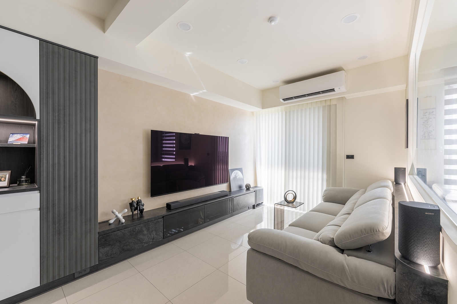 為了平衡低彩度帶來的冷峻感,電視主牆選用帶有溫潤氣息的蜜桃奶昔色,增添一抹淡雅且溫馨的氛圍。考量到男主人非常喜歡觀影,客廳特別依據視聽需求設置機櫃,並在沙發後方規劃一道以石紋系統板打造的半高牆,不僅作為環繞音響的擺放基座,同時也兼具舒適靠背的功能。半高牆內部更設有燈帶,在觀影時提供柔和的光氛,更具情境感與沉浸氛圍。