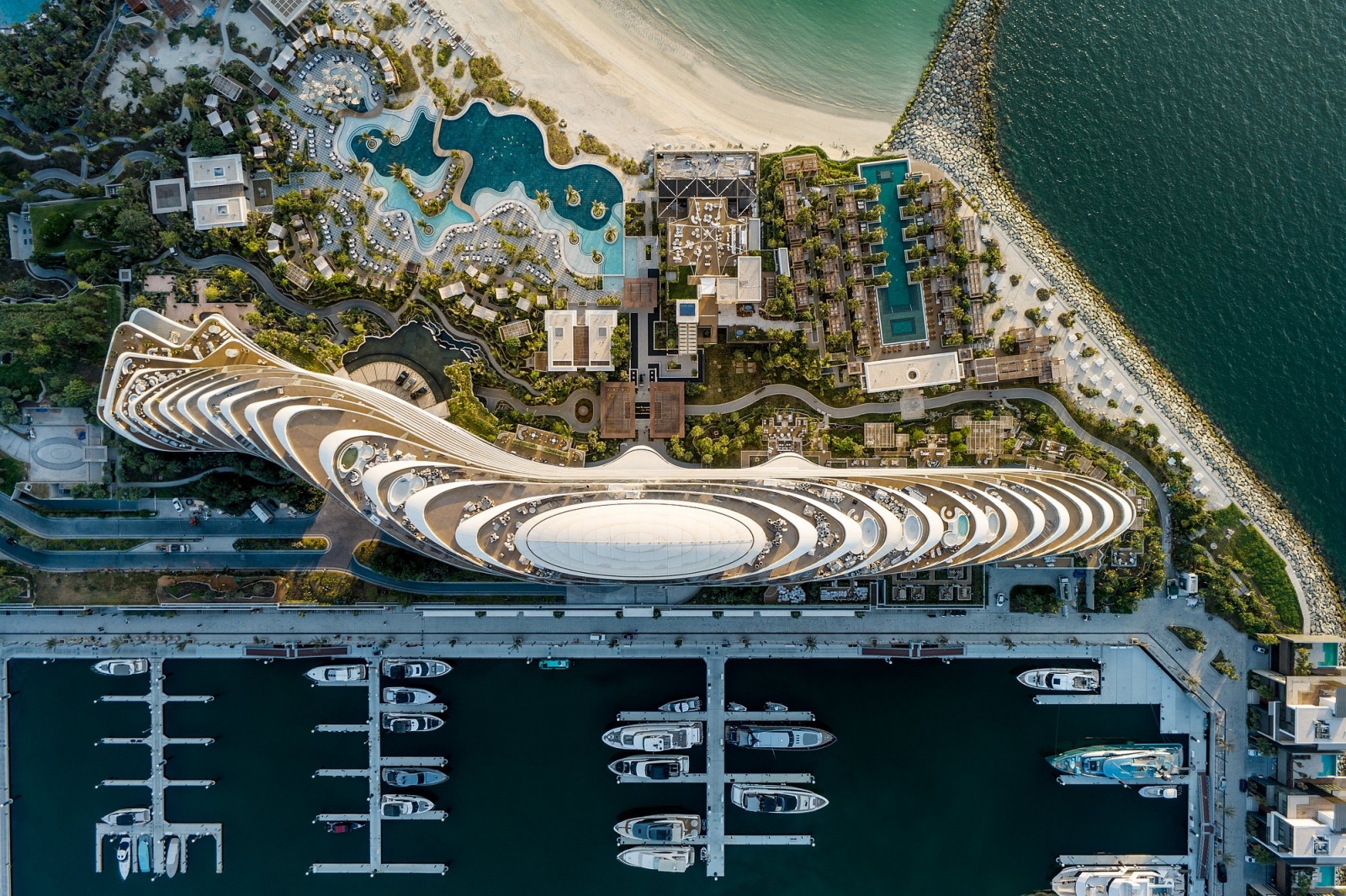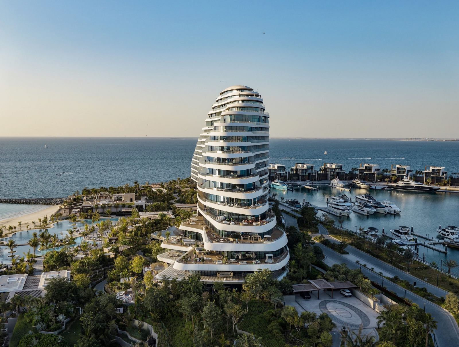 飯店共設有386間客房與套房,其中包含四間極具象徵意義的超級頂層公寓,以及82套品牌飯店式公寓,皆可將阿拉伯灣的壯麗景緻盡收眼底。建築座落於一座私人半島之上,配備82個可停泊最長達61公尺遊艇的泊位,並提供完整而尊榮的碼頭服務,滿足高端航海生活的需求。從設計之初,團隊即強調建築本身的鮮明個性必須與周遭環境的尊重與和諧並行,致力於打造一座宛如藝術雕塑般精緻、純粹而富有力量感的建築作品。