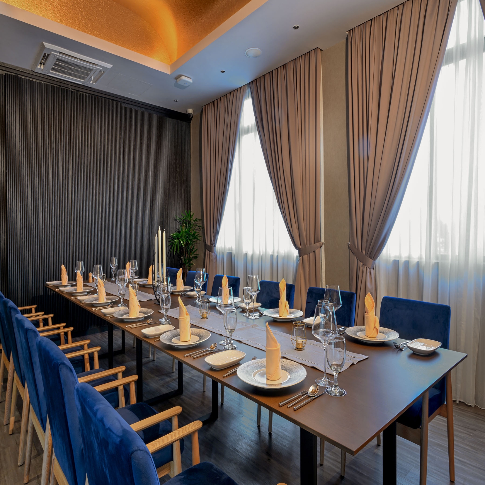 Segregated by a ramp up space, on the right we have Dusk Restaurant coming from the lift or stairways. One would be greeted with a floral-patterned ceiling to welcome for some photographic experience. Stepping into the main dining, you would be impressed with the heighten space where we raised the overall space by 600mm from the existing structure. The ceiling is also treated with a floral motif to emphasize the garden feel where you could wine and Dine with the Best Sunset Views. You can Immerse yourself in the breathtaking sunset within a cozy alfresco ambience, and delight in specially crafted Modern European settings with Asian influence.