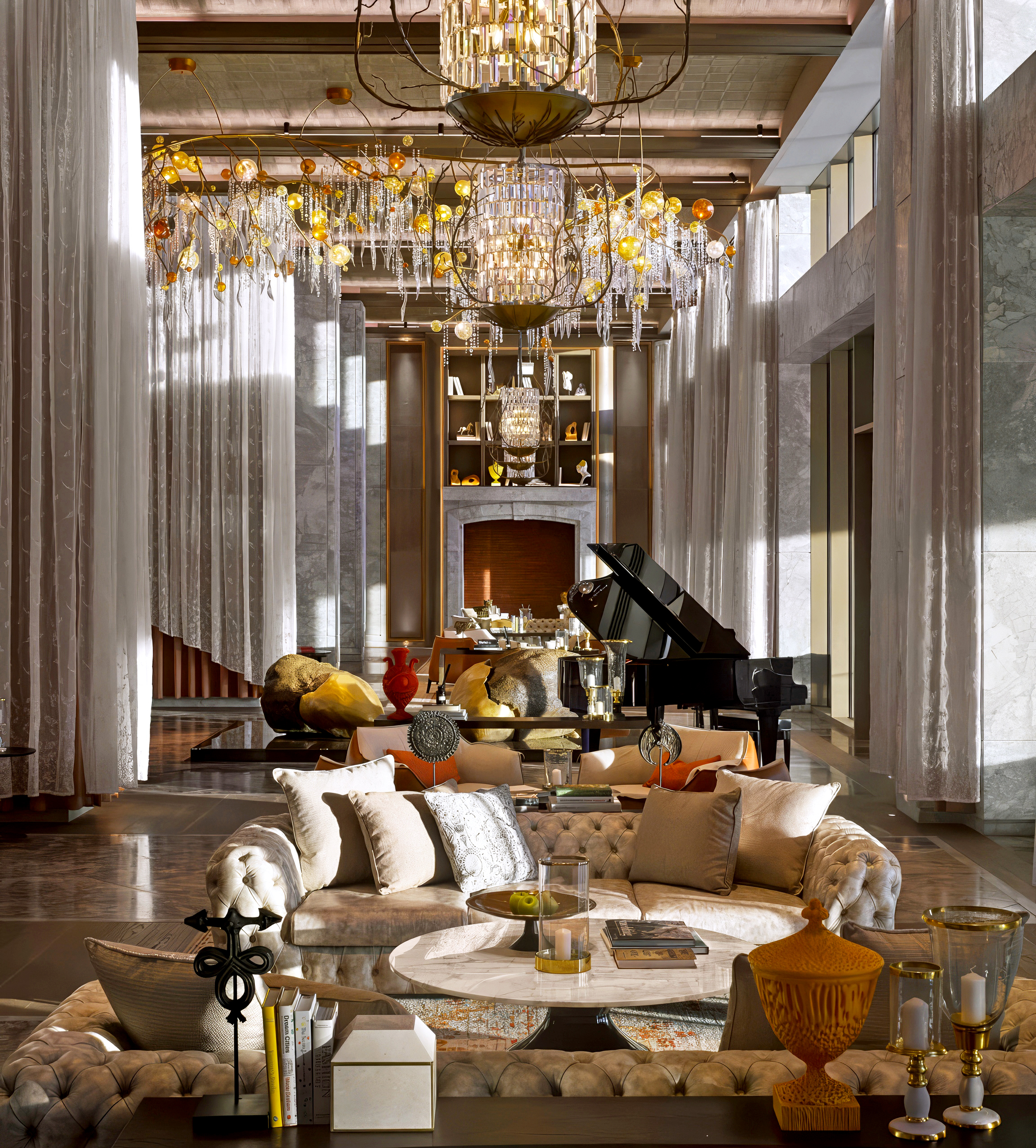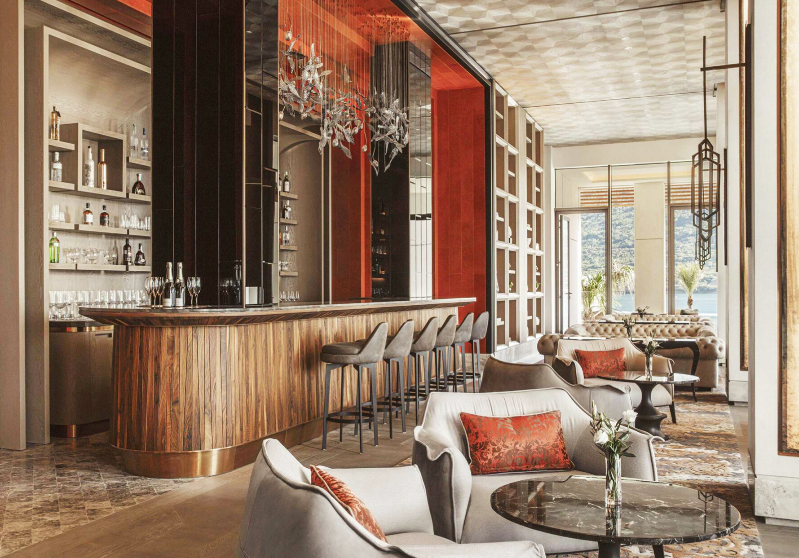 大廳語彙建立於時間的沉澱感之上。室內整合灰色卡拉拉大理石地坪與仿舊石牆,藉由石材質地回應蒙特內哥羅傳統建築,為基底注入穩定的歷史紋理。挑高結構與層疊材質拉開尺度,沙色馬賽克拱頂體現對比例的嚴謹考究;柱面銜接輕盈紗簾與暖沙色調帷幕,平衡結構的重量感。視線隨石紋延伸至海灣,取材自國花「銀合歡」的手吹玻璃燈飾點染出細膩光暈,賦予修道院原型內斂的當代表情,構築出兼具地景厚度與洗鍊奢華的張力。