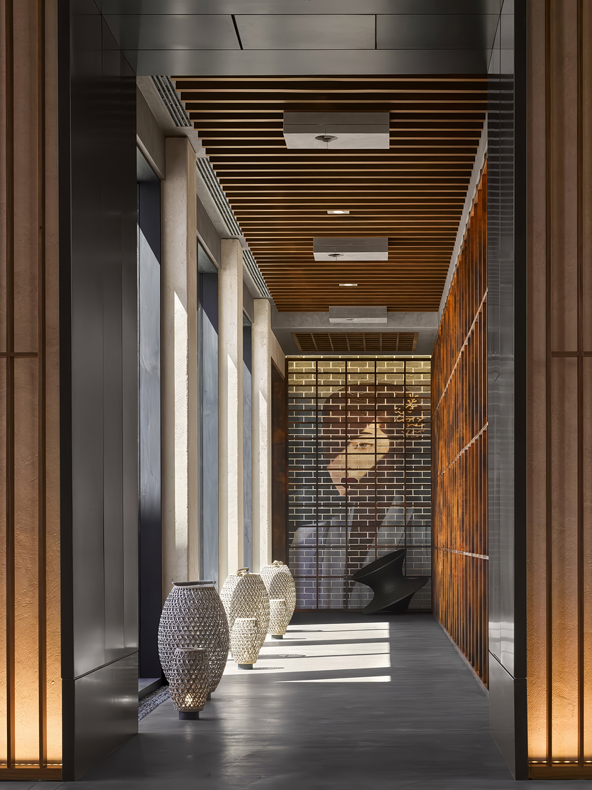 通往水療中心的路徑是邁向安定的儀式,汲取修道院迴廊的幾何語言,以俐落的金屬線條勾勒拱門形廓,與溫潤的沙色石牆形成剛柔並濟的對照。地坪交錯的幾何磚面引領視線緩緩推移,規律拱廊在視覺中層疊縮放。行進至水療核心,泳池區以銀色洞石與洗灰橡木構成穩定基底,搭配焦橙色調引導能量流動。弧形牆體與半圍合配置營造包覆感,消融喧囂復歸平靜。石材、金屬與柔光在明暗推移間交織,形塑出內斂而深層的奢華氣韻。