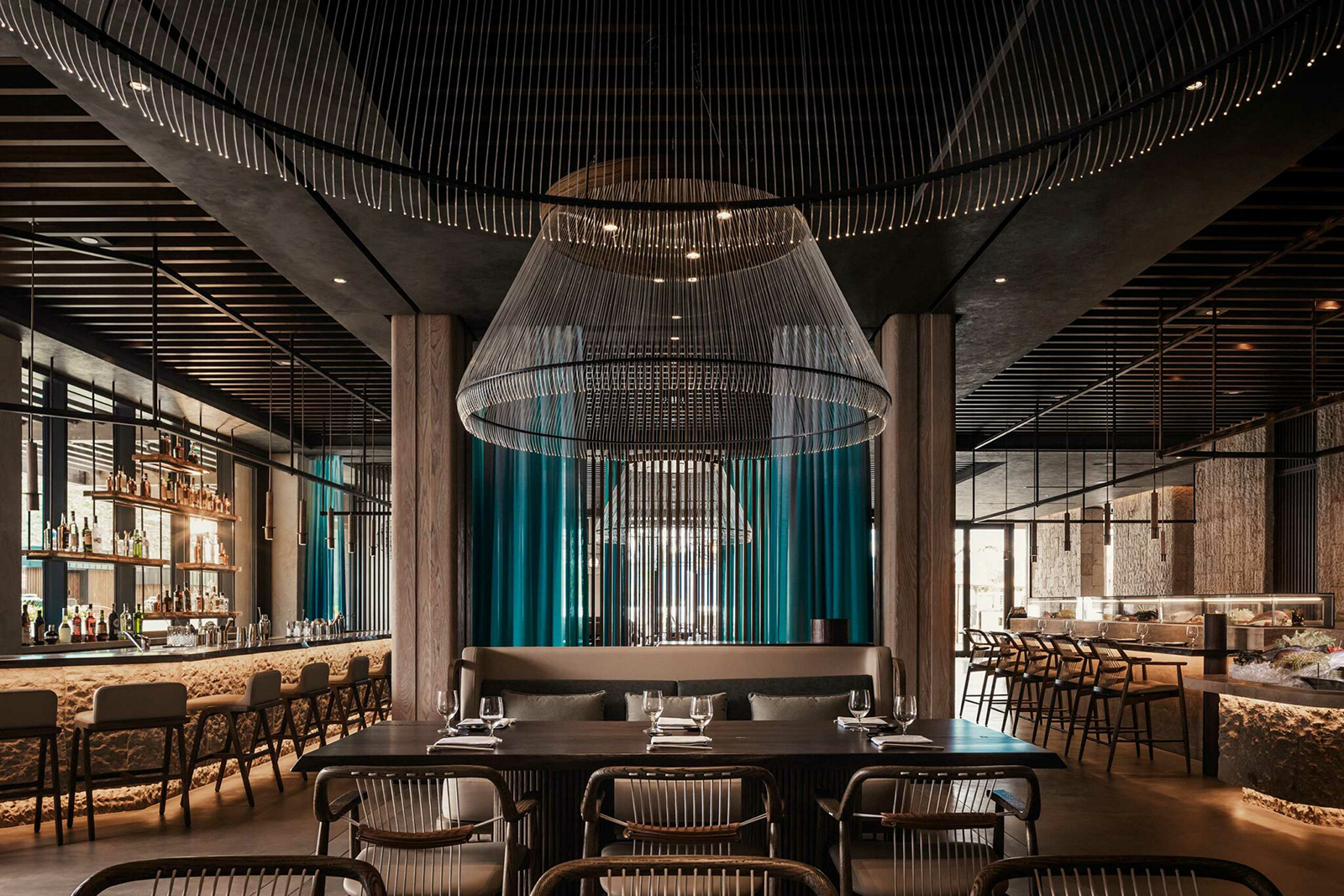 餐廳融合泛亞料理與日本侘寂美學,運用深色木格柵與金屬線條,構築出規律的垂直紋理,與戶外波光粼粼的海灣形成視覺呼應。原木吧檯區背景採用粗獷的天然石材堆疊,其凹凸起伏的質地在暖黃嵌燈的洗映下,展現出強烈的立體厚度。中央懸掛線狀吊燈,細膩的結構彷彿捕魚網具的現代轉譯,在空中勾勒出輕盈的幾何體積。半透明的藍綠色紗質帷幕如波浪般垂墜,在光影流動間注入地中海般的寧謐與層次。吧檯區採用剔透的晶體裝飾,內含沙粒的手吹玻璃燈飾點綴其間,呼應海邊沙粒在陽光折射下的質感;光感如水波般流轉,回歸海岸日常的從容狀態。
