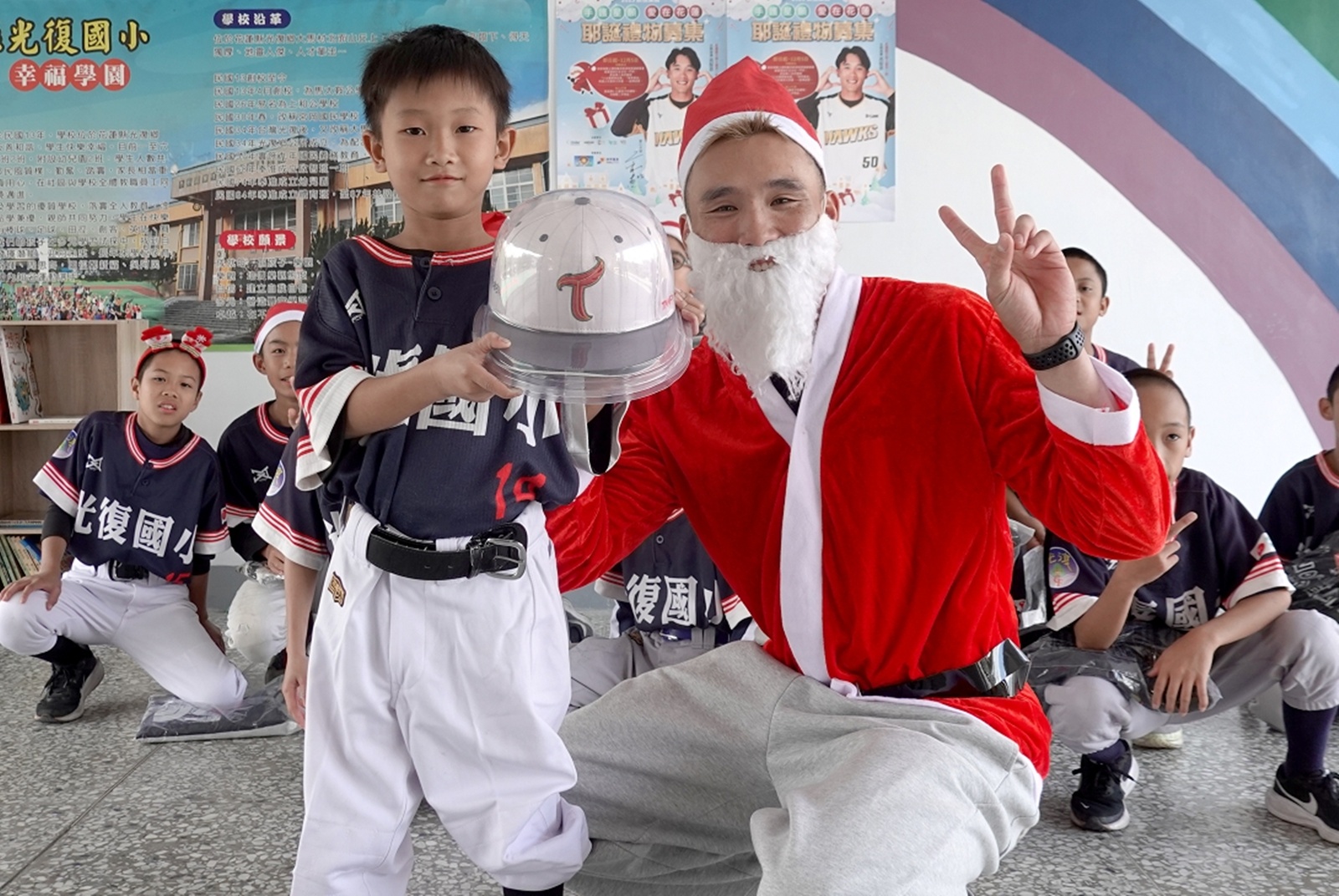 高聖恩來到光復國小母校,準備簽名球帽送給棒球學弟,歐德集團也送上帽T,溫暖孩子的心。