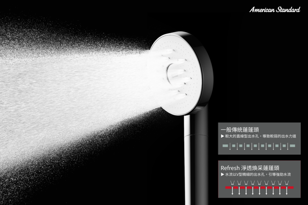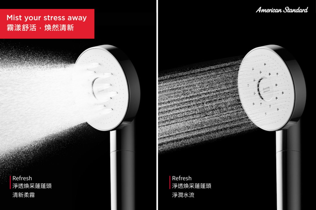 American Standard 全新手持蓮蓬頭 Refresh Hand Shower,外觀的俐落線條設計,搭配兩種柔膚的出水模式,淨潤水流模式以V型精細的出水孔,引導強勁水流,帶來暢快的沐浴體驗;清新柔霧模式能溫和帶走毛孔中的雜質與多餘油脂。背面獨特按鈕設計,淋浴時單手即可一鍵操作,切換出水模式,依照個人沐浴需求,洗淨從頭到腳不同膚況的肌膚。在家就能享受潔淨細緻的柔霧淋浴,運動後毛孔暢開時,也能以溫和水霧帶走髒污,有效減少對肌膚屏障的傷害,帶來身心舒緩的全新體驗。
