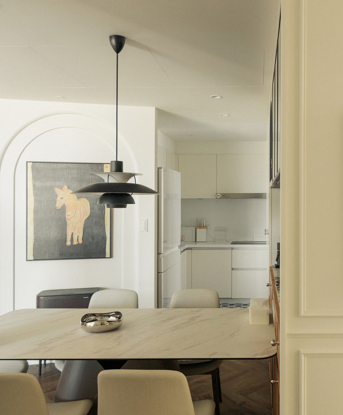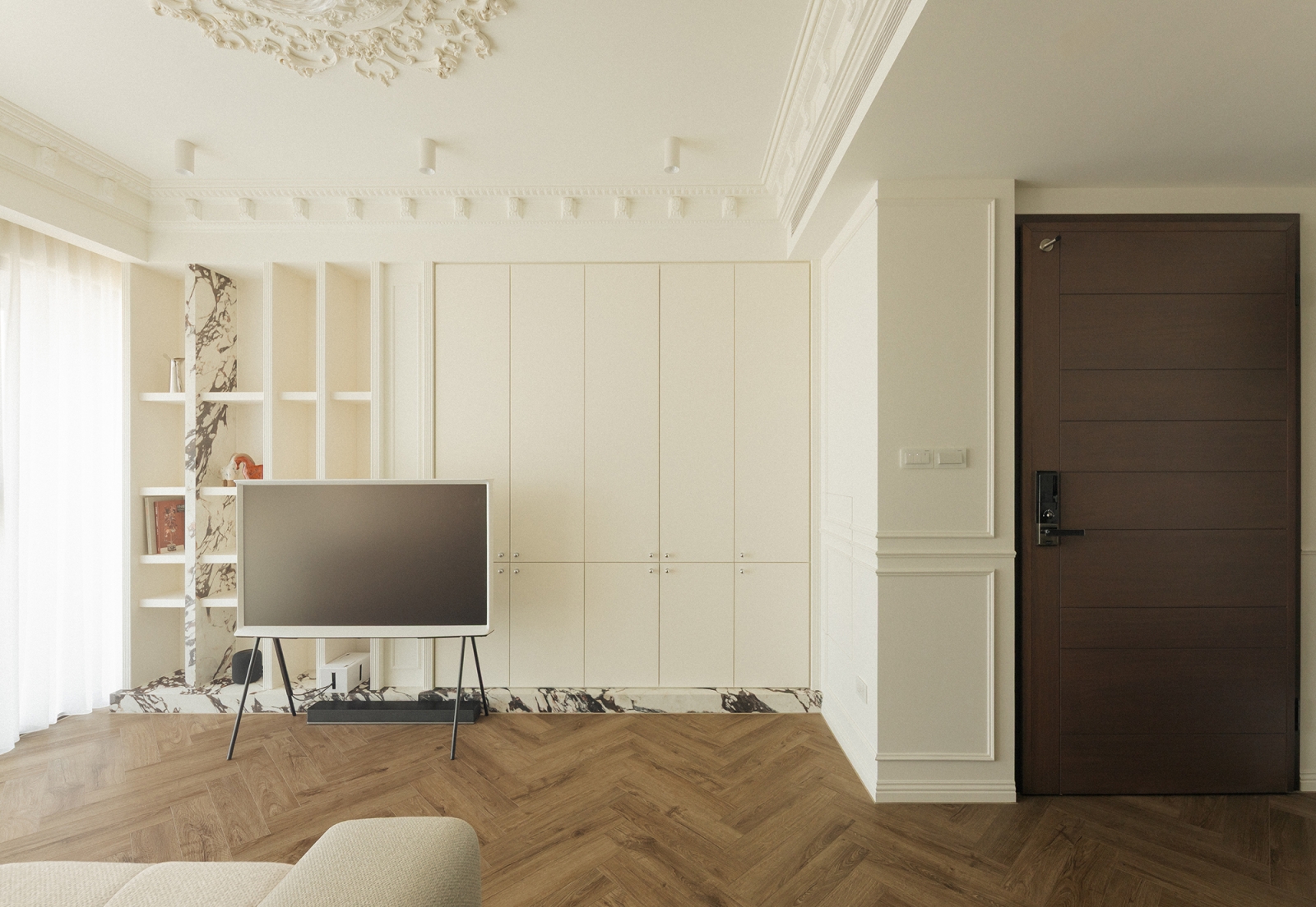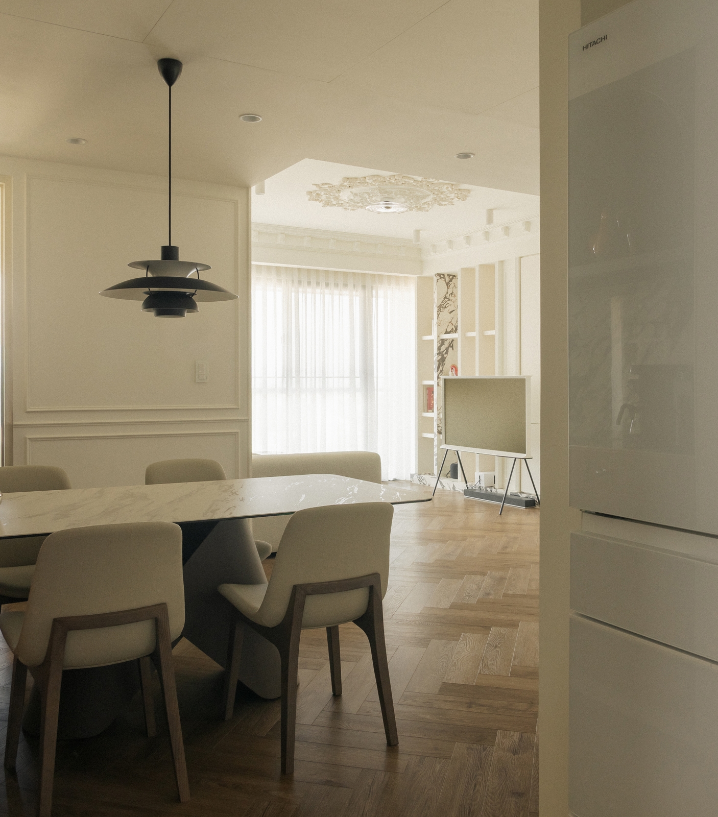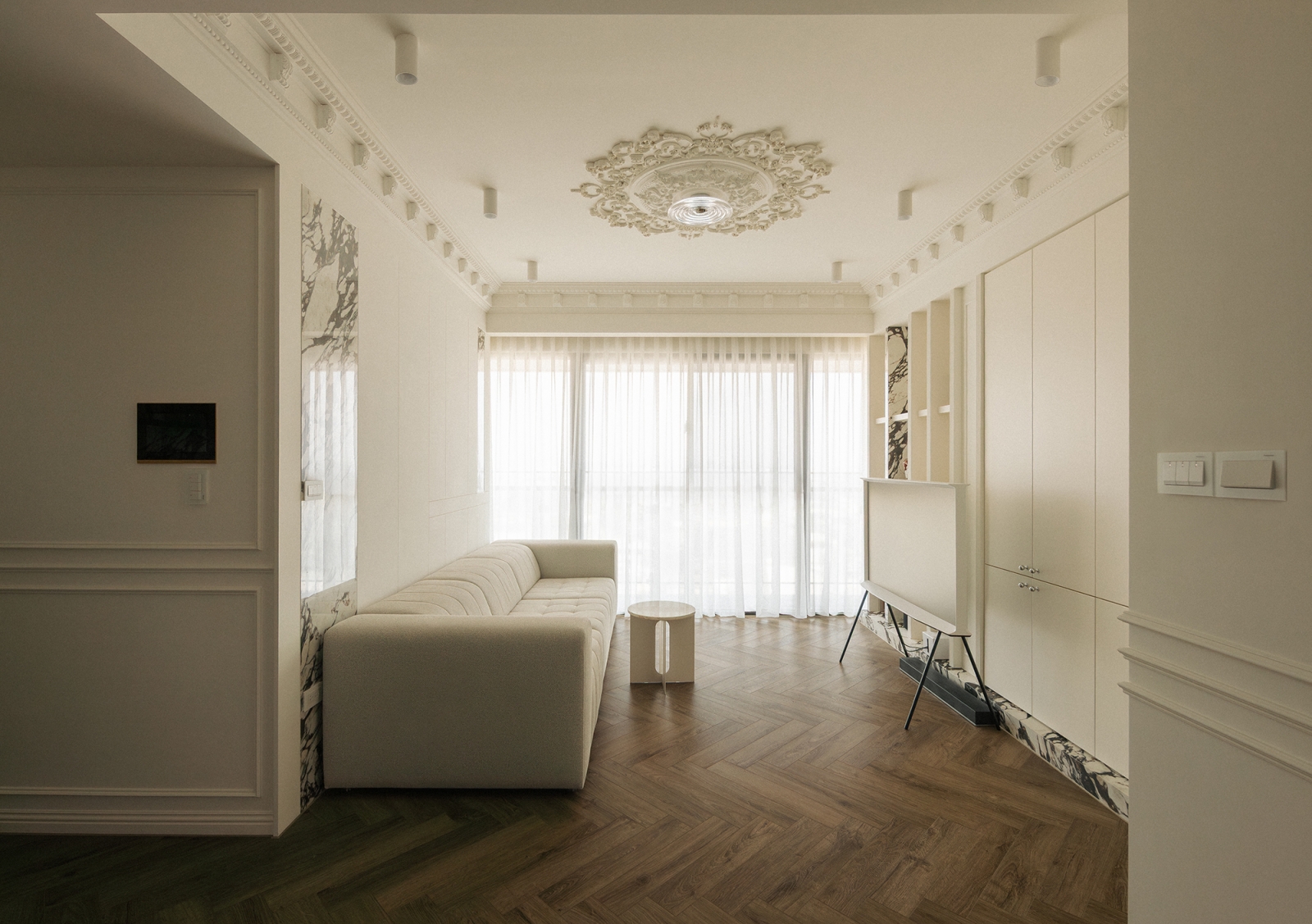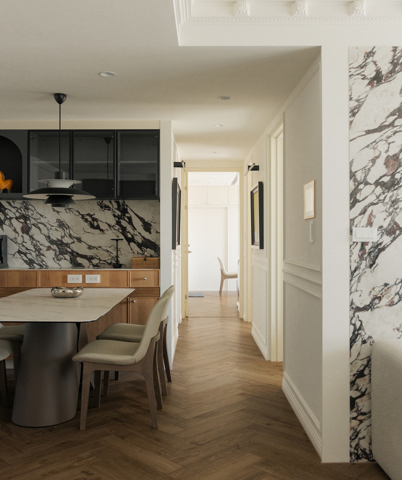 空間由玄關進入,奶油白與人字拼地板奠定優雅基調。斜面收邊的鞋櫃確保主要動線寬度,牆面拱形語彙減少轉角壓迫,自然引導視線進入公共區域。客廳天花板配置圓形浮雕與古典疊級線板,強化垂直向度層次;電視牆納入展示與收納機能,配置可移動式電視,使場域保持開闊。潑墨紋大理石由基座延伸至牆面並銜接餐區,形成連續的橫向視覺軸線。餐區作為家庭核心,餐桌與邊櫃結合,圓弧壁龕與玄關形成視覺呼應,並配置插座滿足共食與辦公需求。走廊以藝廊概念串聯公私領域,牆面壁畫與燈光節奏賦予行走過程層次變化。主臥床頭牆面延續線板語彙並採對稱配置,落地式滑門衣櫃方便大型行李箱進出,回應屋主生活型態,使收納更貼近日常使用。