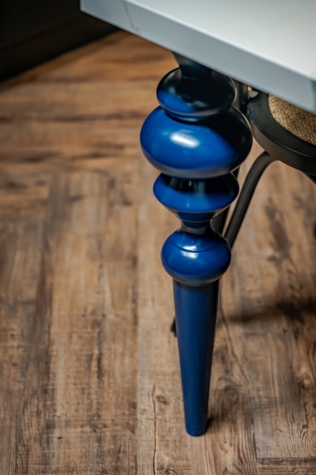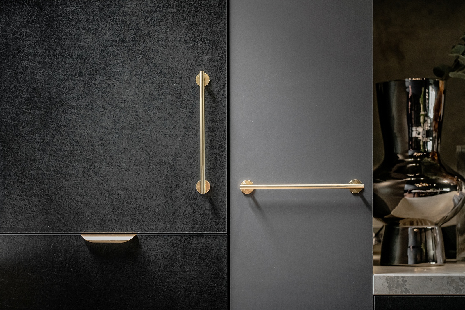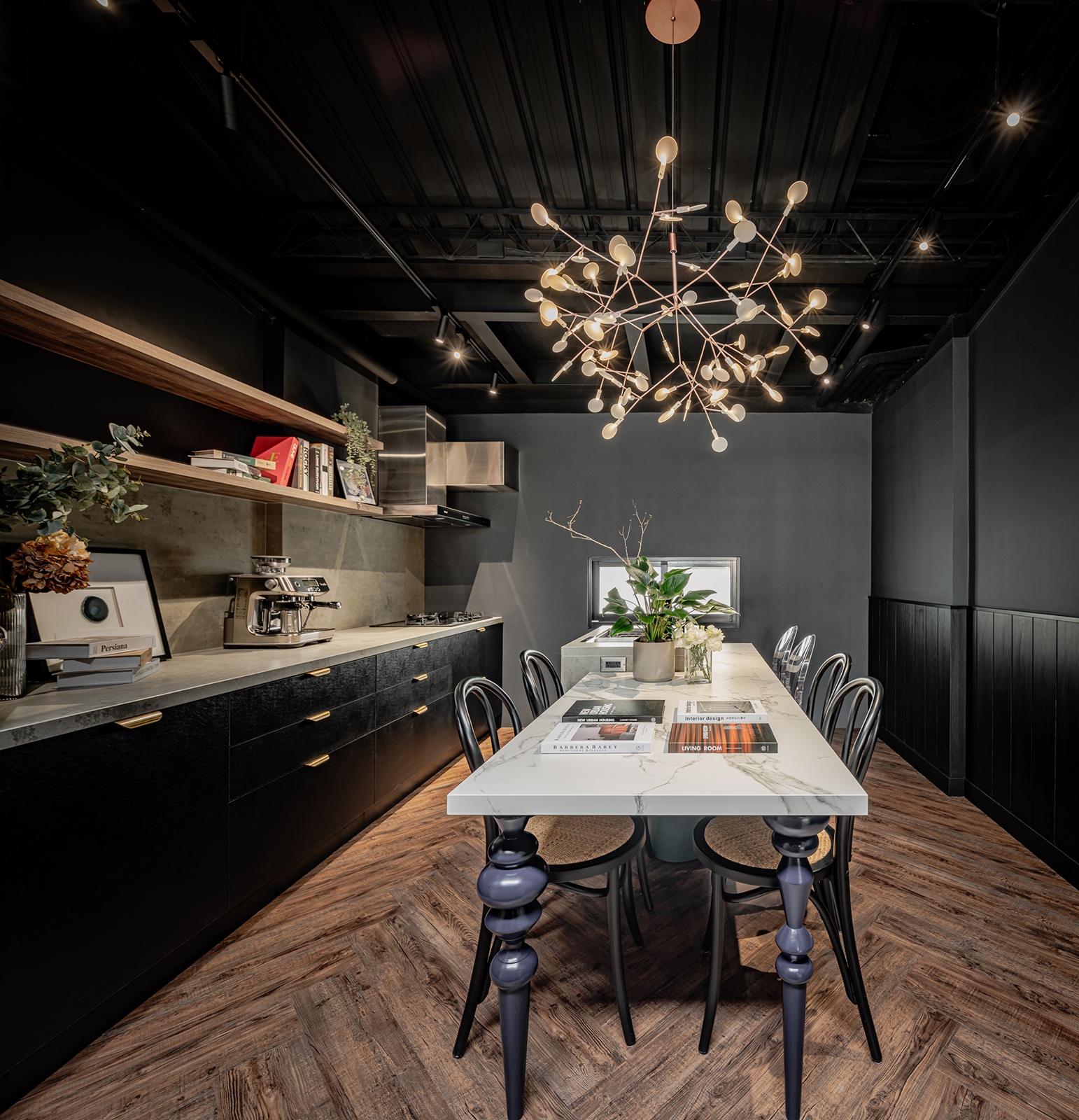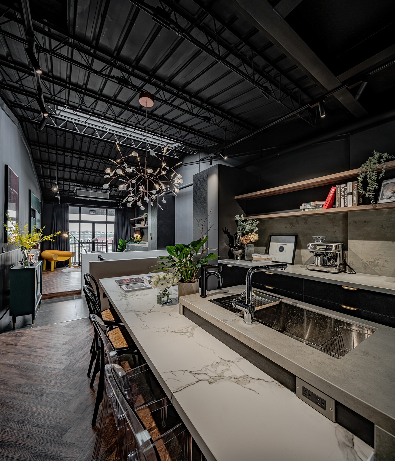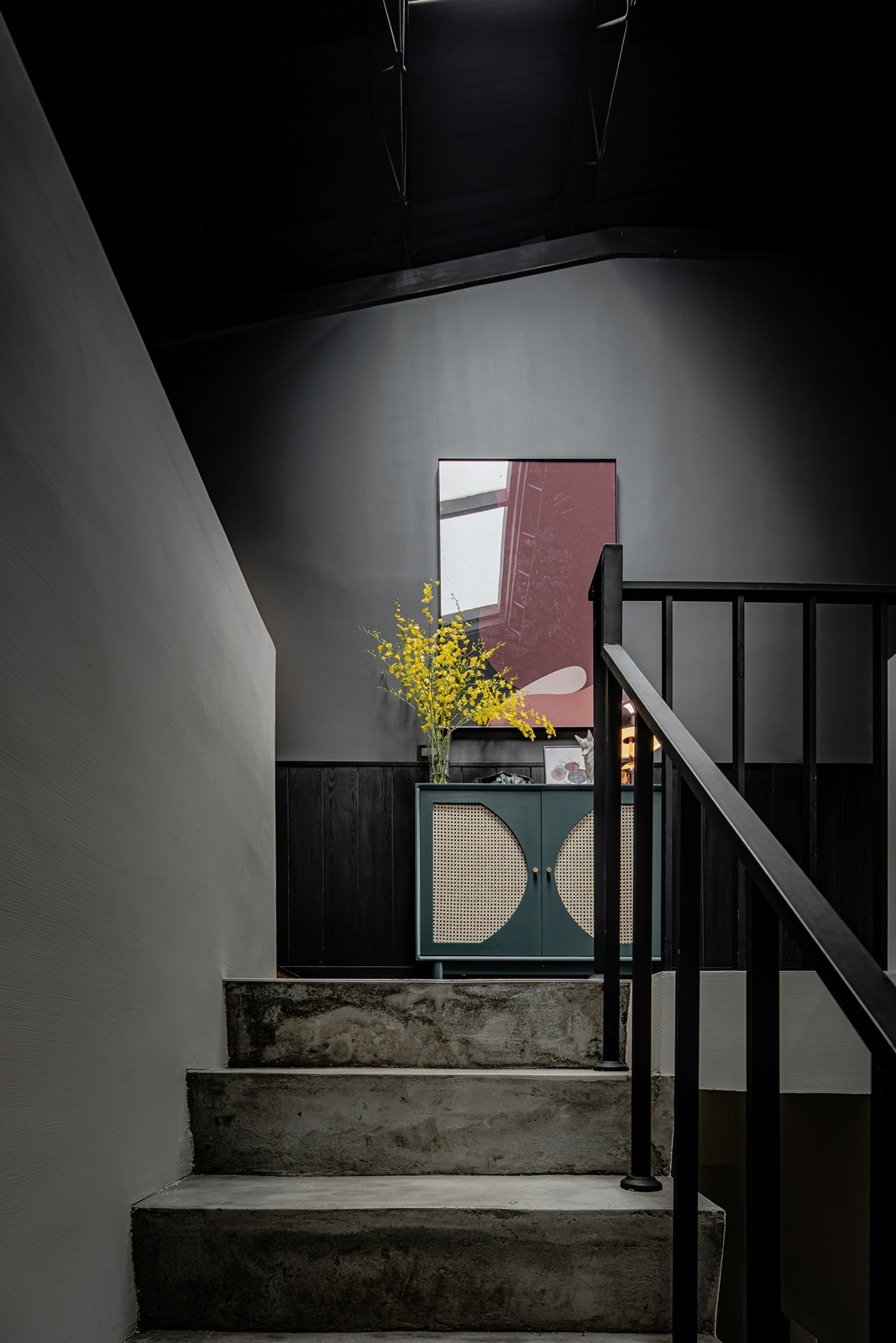 整體空間以黑灰為基調,佐以溫潤的人字拼木地坪襯底。樓梯保留原有結構,以清水混凝土與鐵件扶手呈現質樸感,端景的深綠藤編櫃則作為視覺焦點。左邊的交流休憩區,以淺色帝通石檯面連接灰色耐麗石的料理台,輔以深藍色實木桌腳。後方備餐的深色櫃體上,則以拋光黃銅五金把手點綴,提升細節精緻度。