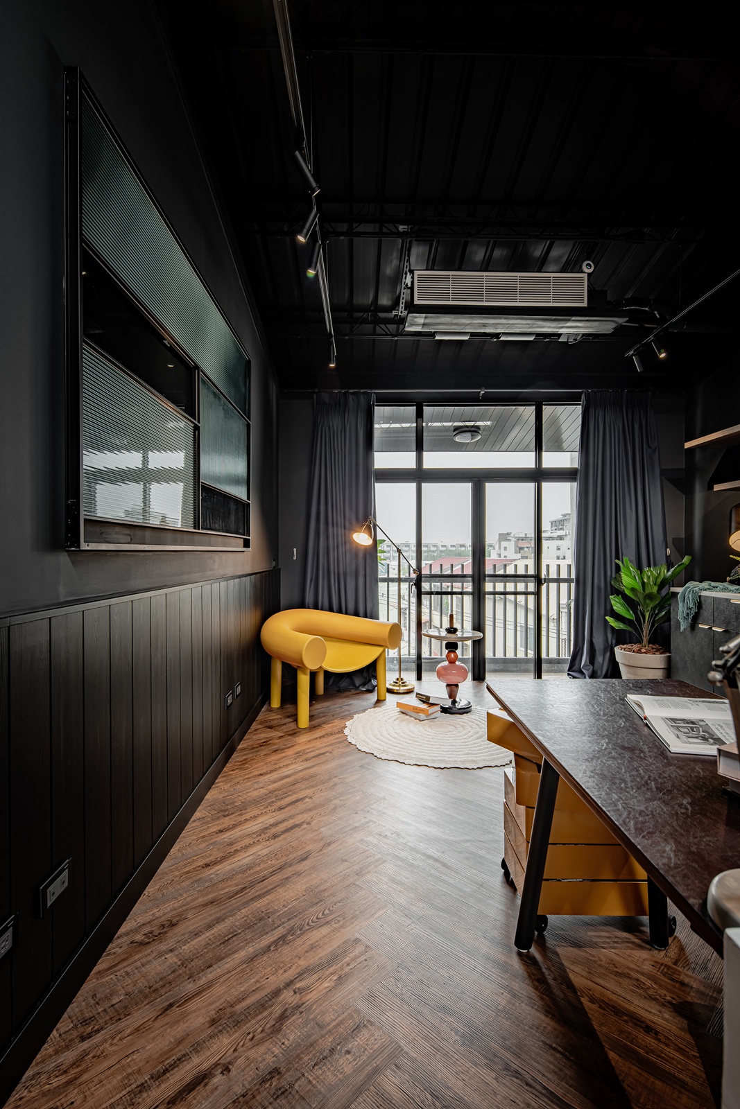 工作區域採大尺度開窗,讓自然光成為最重要的視覺元素。牆上的長虹玻璃窗做為視覺過渡,讓光影流動,呼應以光影替空間說話的設計理念。落地窗旁的黃色曲線單椅,為空間注入生動的活力。家具細節透過樹枝狀的吊燈、水紋玻璃隔板、木皮層架等多樣材質,豐富視覺節奏與秩序。