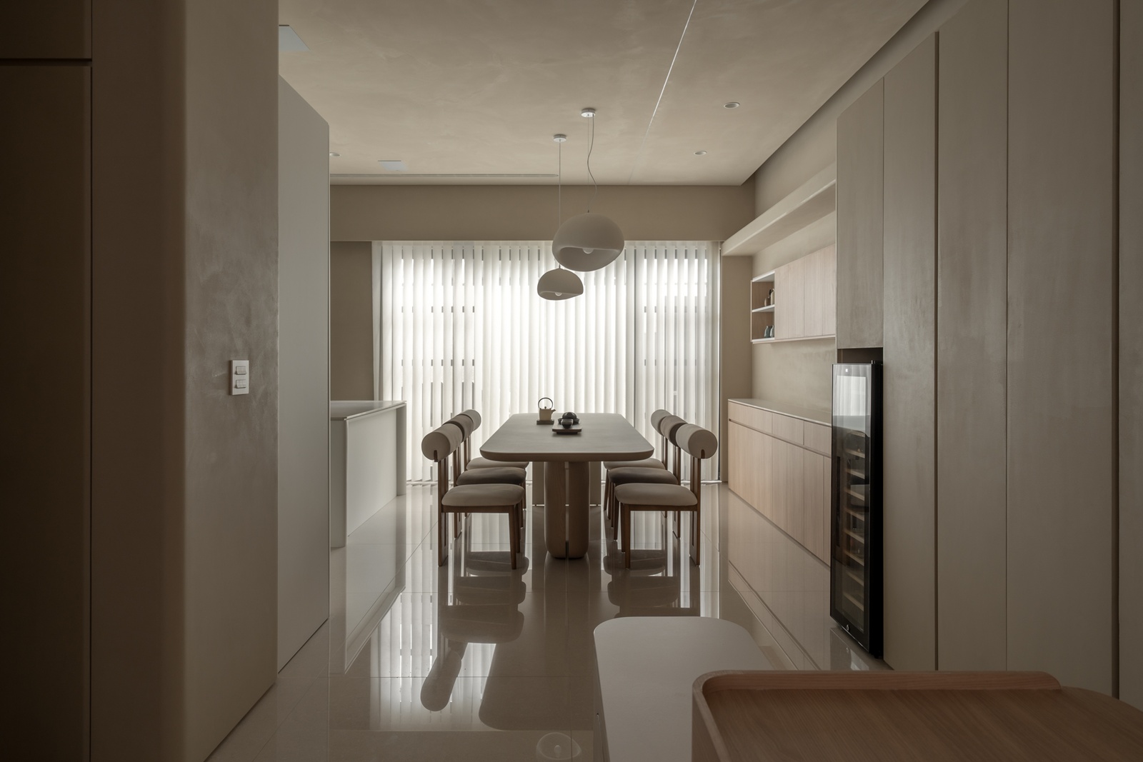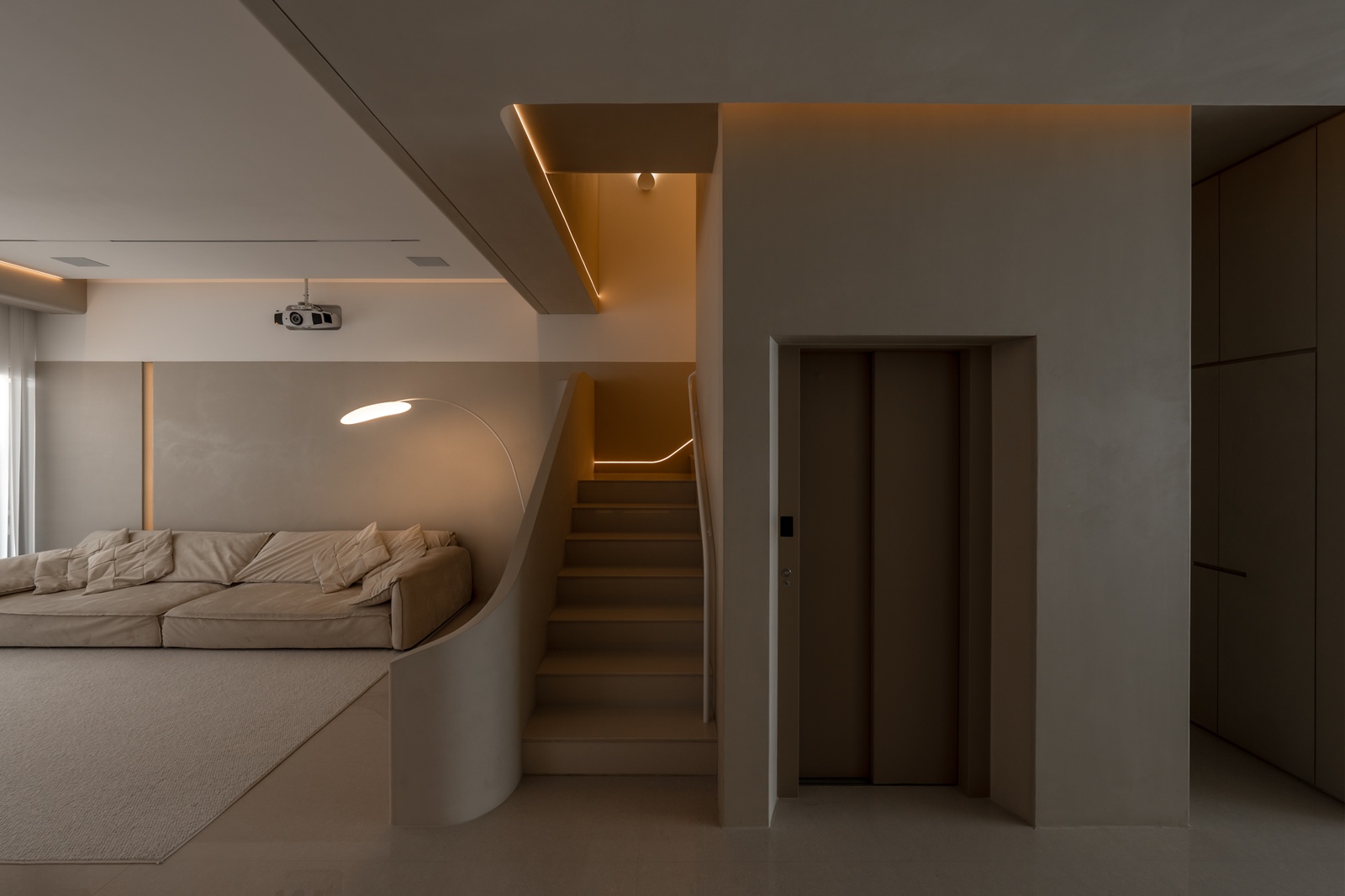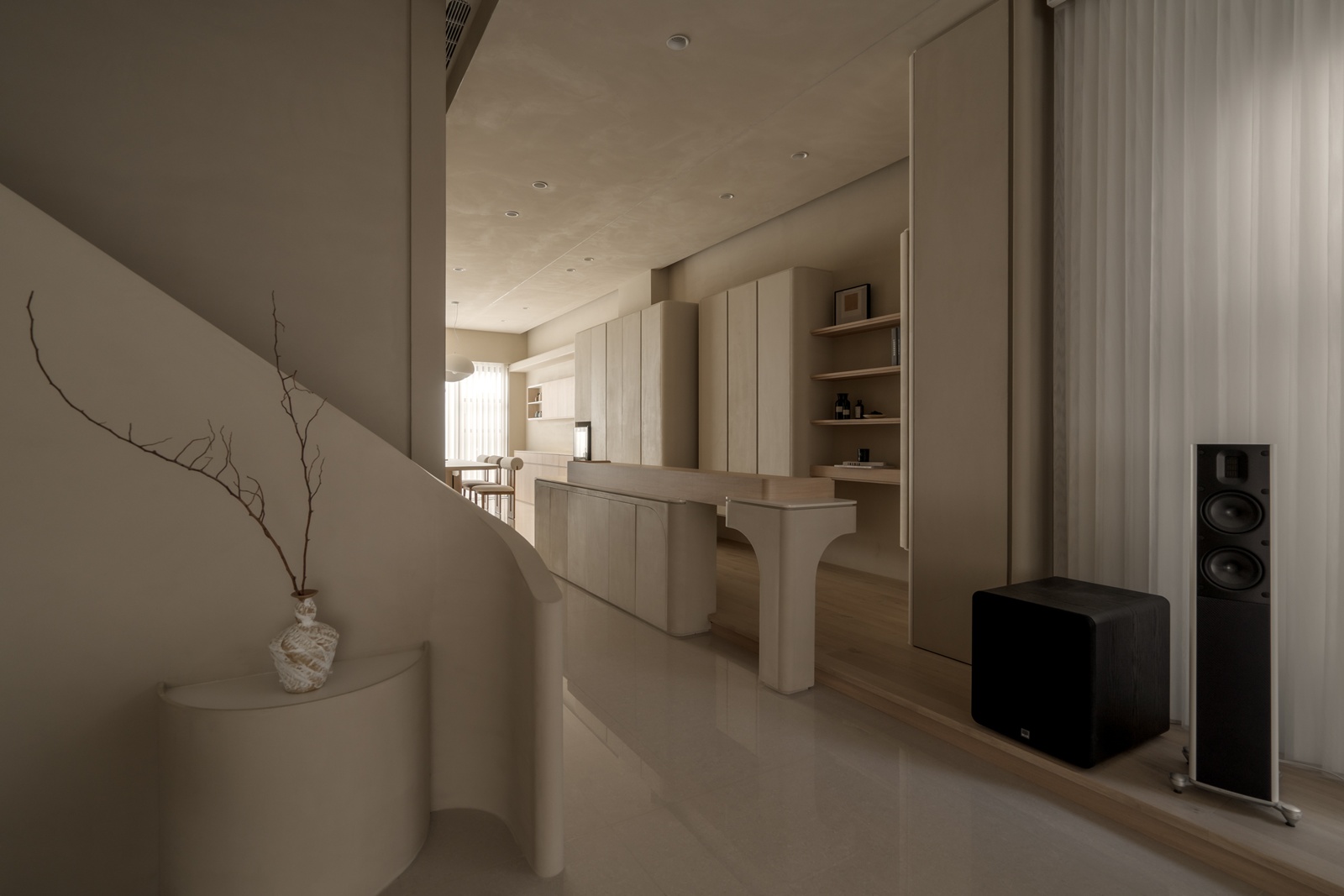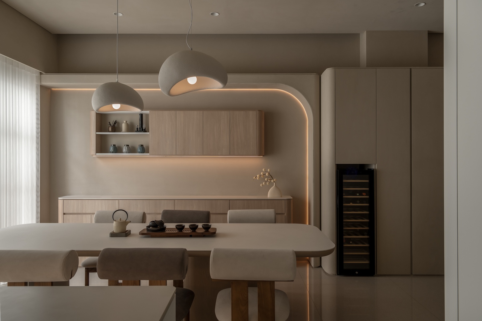 公共空間中,客廳以減法收納與圓角轉折維持輕盈感,電視牆大面開窗引入自然光,紗簾柔化眩光;夜晚則由光帶與間接燈源轉換氛圍,帶來安定感受。娛樂功能整合於櫃體內,升降投影幕與音響兼顧美感與整潔。樓梯以曲線扶手串聯動線,轉折面圓角與側燈條提升安全;旁側過渡區域轉化為閱讀角落,讓動線蘊含停留價值。餐廚區域中,中島緊鄰一字型廚具形成高效動線,獨立餐桌臨近採光面,也作為交流舞台。弧形燈帶與間接光串聯烹飪與餐敘,搭配吊燈情境錨點,展現柔和氛圍。
