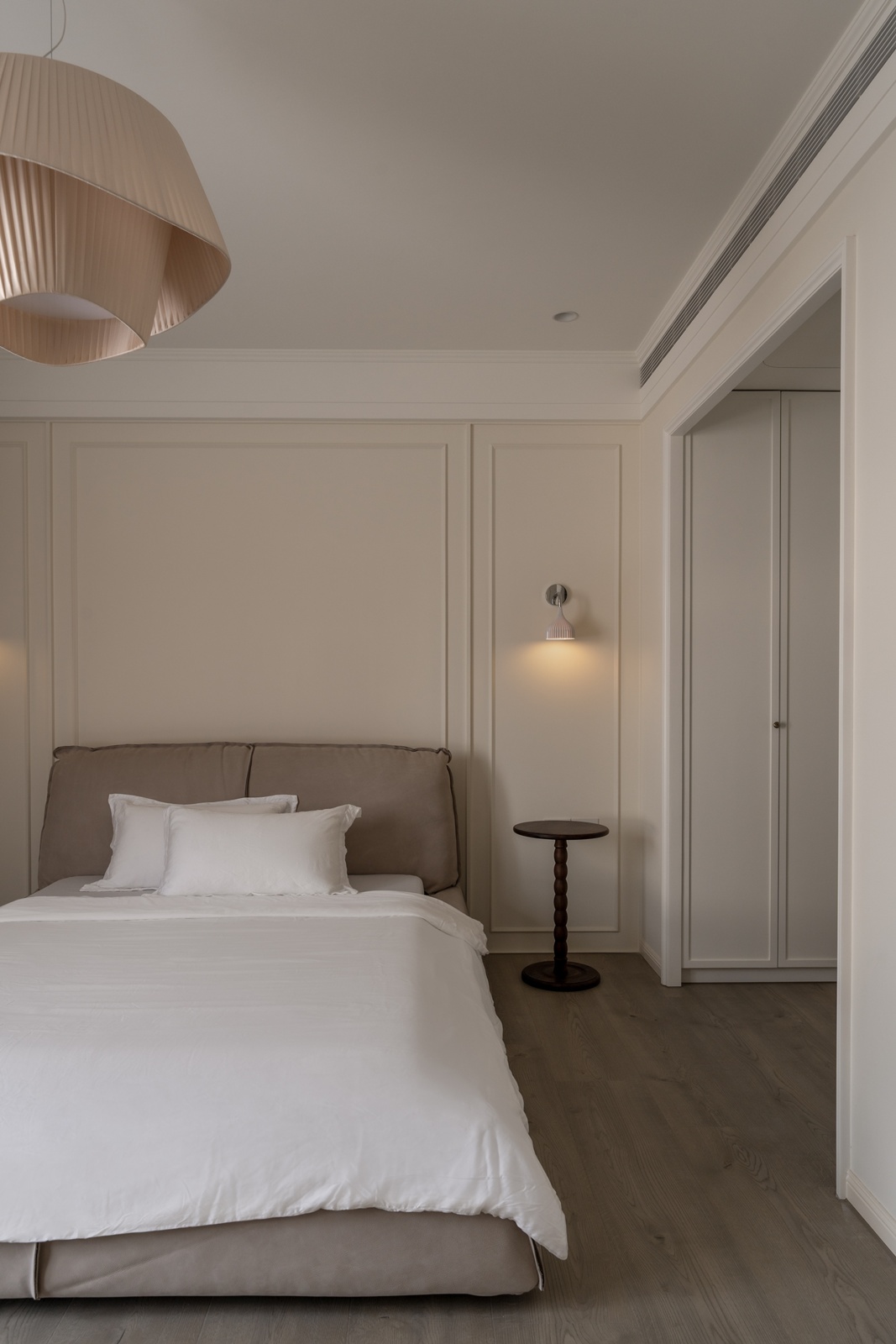 私領域延續柔和語彙與光影層次。主臥床頭弧形燈帶與環形間接光創造漂浮感,曲面量體銜接書桌並結合收納,維持俐落秩序。兒童房以淺米白色為基調,抬高床鋪界定專屬領域,牆面洞洞板與層架具彈性,伴隨成長需求;自然光與嵌入式燈帶隨時序變化光感,織品與布偶增添溫度。