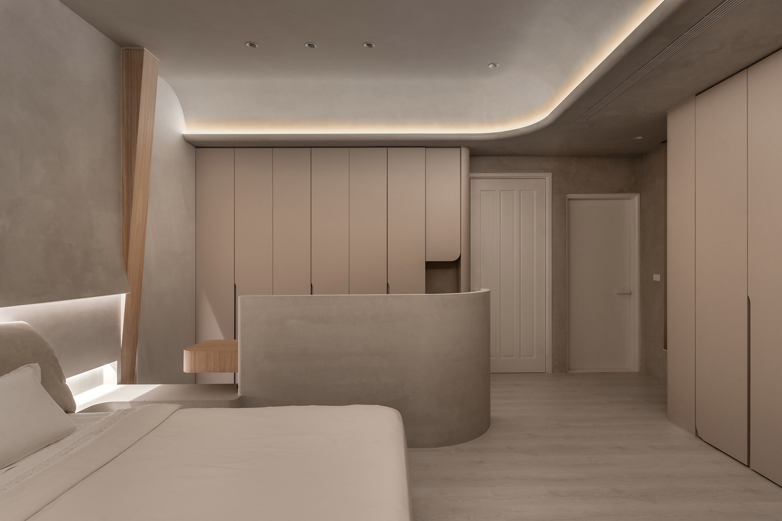 本案以「柔和曲線、溫潤材質、光影層次」為核心語彙,透過圓角收邊與隱藏收納,消弭量體銳利感,塑造流暢而靜謐的居家氛圍。極簡基調中保留細節溫度,於機能與美感之間取得平衡。