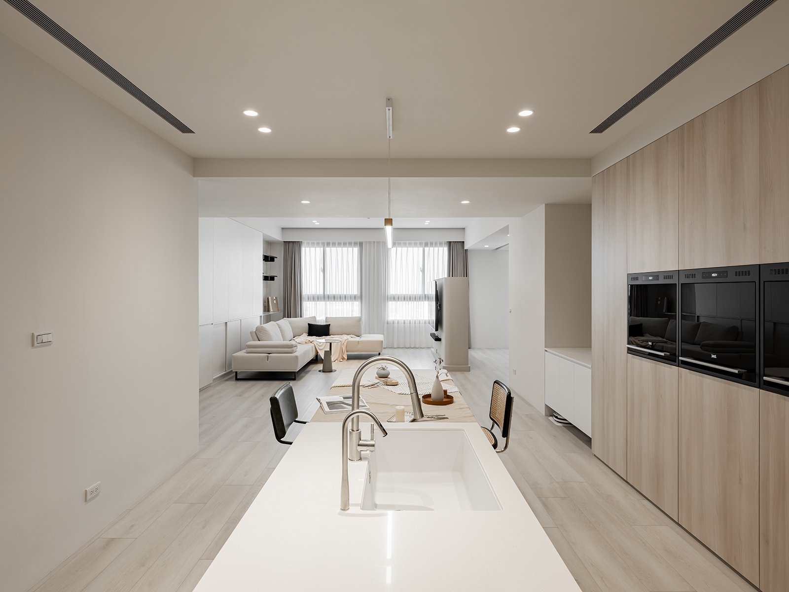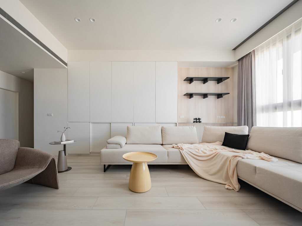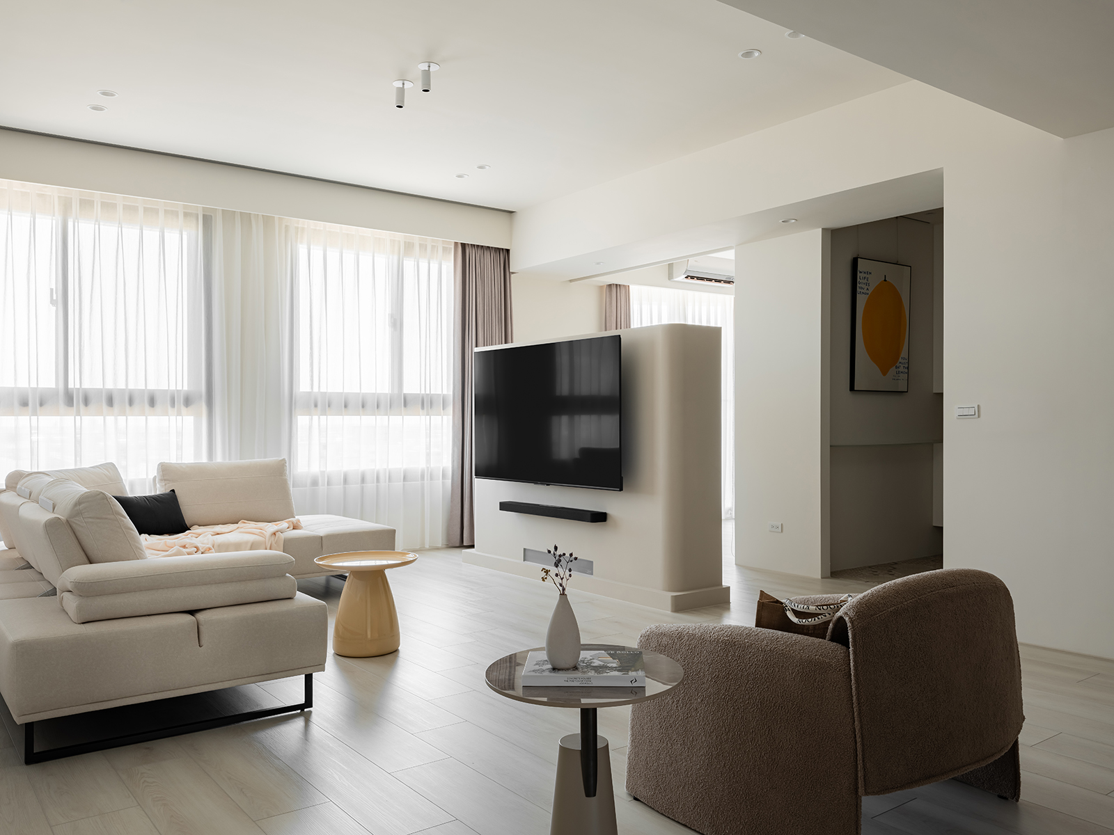 空間中運用藝術塗料,牆面呈現柔和而富層次的肌理,使光影在室內流轉間,增添溫馨與質感。客廳以L型沙發為核心,輔以簡約茶几與單人座椅,營造舒適、明亮的聚會與休閒空間。