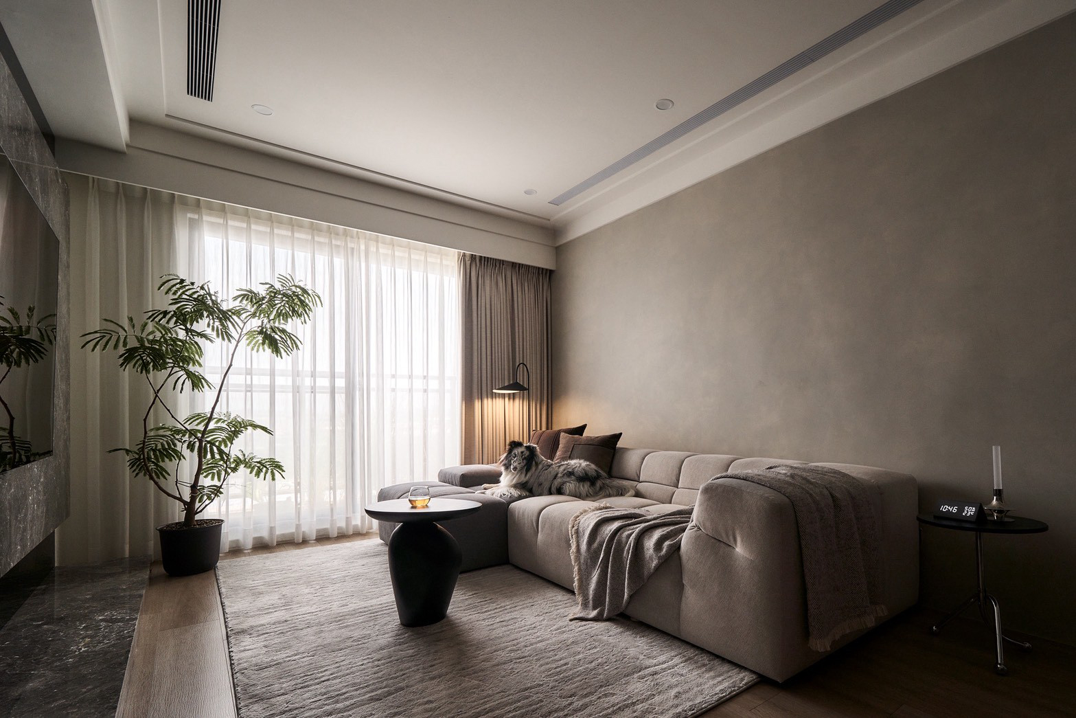 空間中運用藝術塗料,牆面呈現柔和而富層次的肌理,使光影在室內流轉間,增添溫馨與質感。客廳以L型沙發為核心,輔以簡約茶几與單人座椅,營造舒適、明亮的聚會與休閒空間。