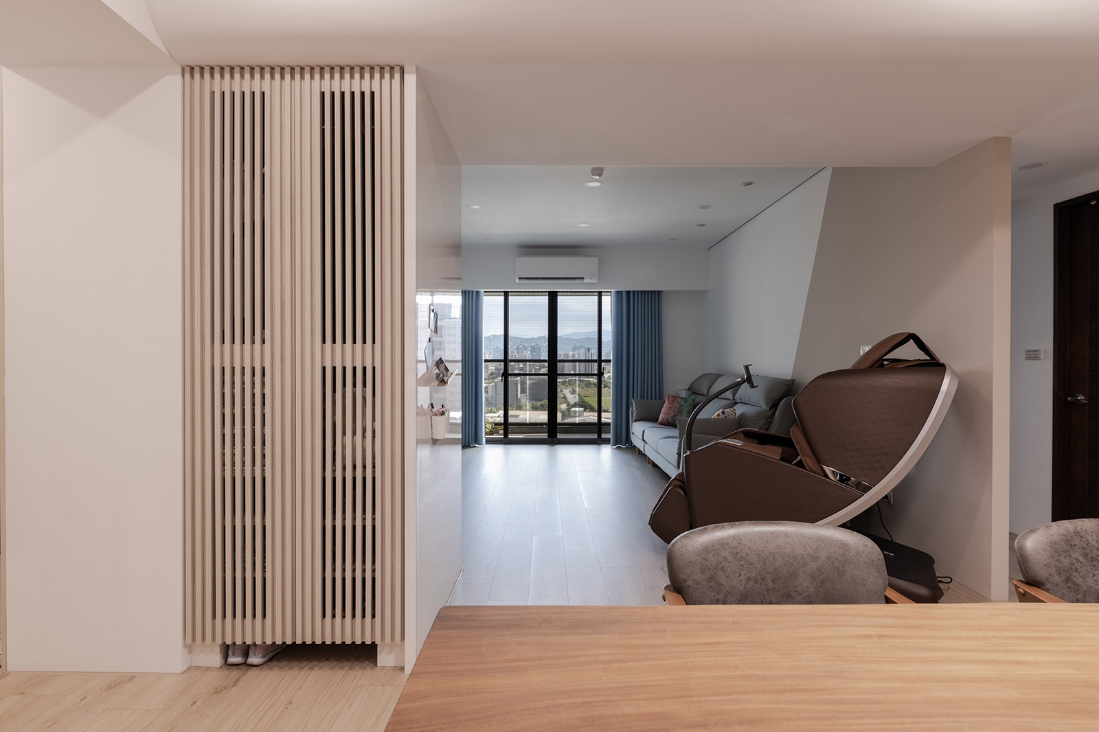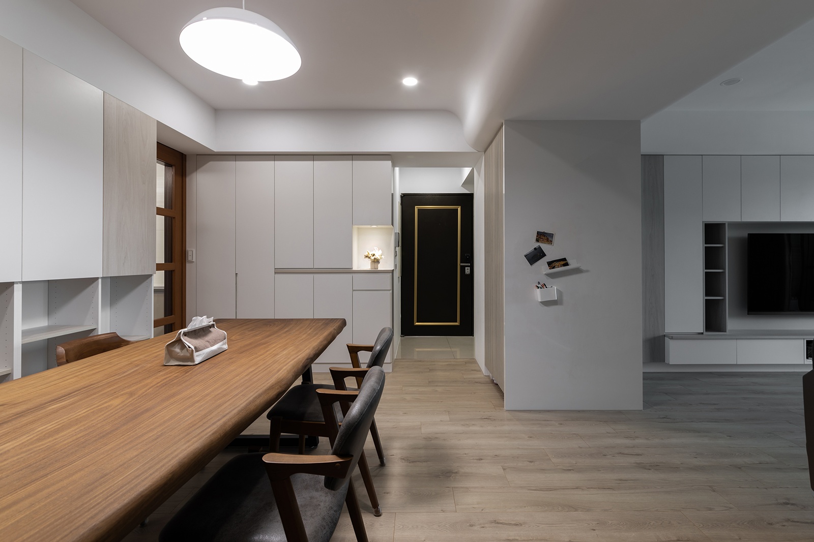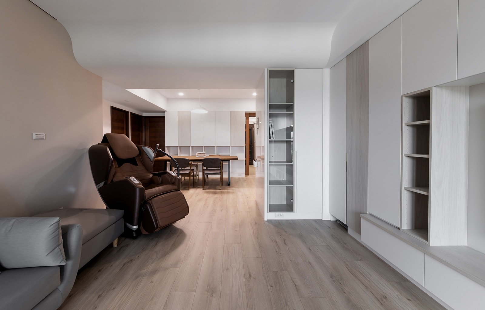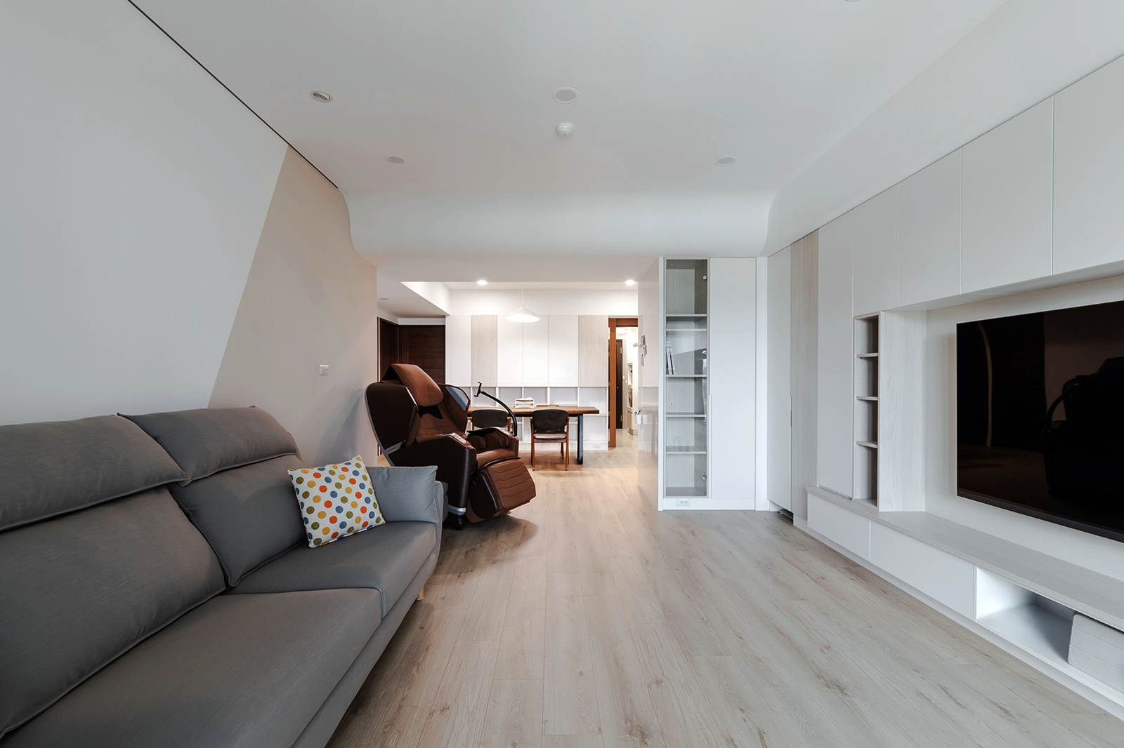 本案為住宅空間設計,設計理念以現代簡約為主軸。空間色調輕柔和煦,白、米色與淺木紋交織,明亮中帶有細膩層次,使氛圍如同日光灑落般舒適寧靜。設計重點包括弧形天花板、磁性塗鴉牆及格柵汙衣櫃,大量隱藏收納不僅擴展空間使用,使孩子能自在玩耍,大人生活更顯從容,讓幸福成為日常流動的旋律。